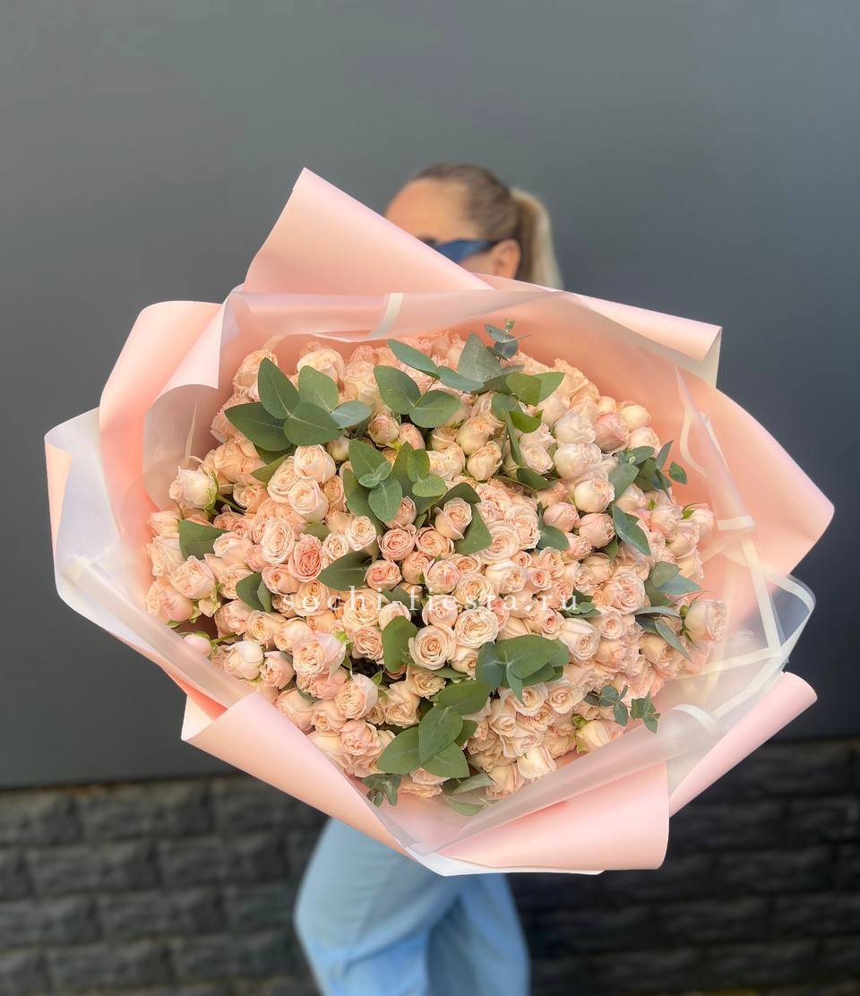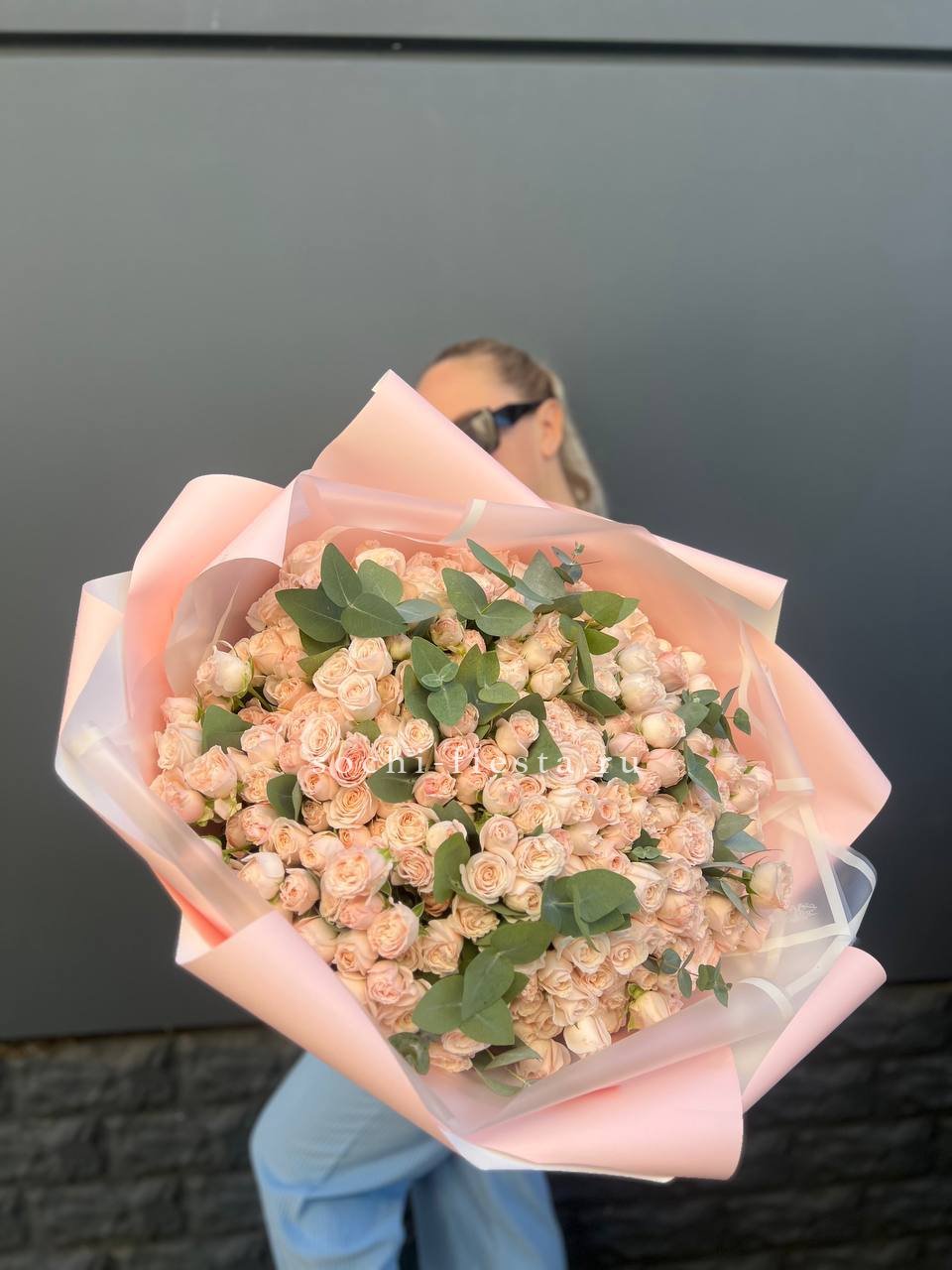 Сто один бутон кенийского пионовидного сорта собраны в масштабную композицию. Белая окантовка лепестков переходит в розовый центр. Впечатляющее присутствие в любом пространстве.