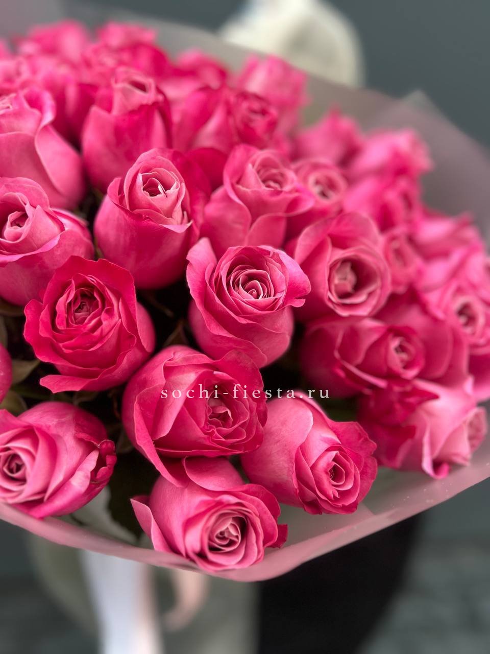 Тридцать один бутон насыщенного красного оттенка собраны в плотную композицию. Упаковка мягко обрамляет цветы, сохраняя естественную форму и позволяя каждому бутону раскрыться в своем ритме.