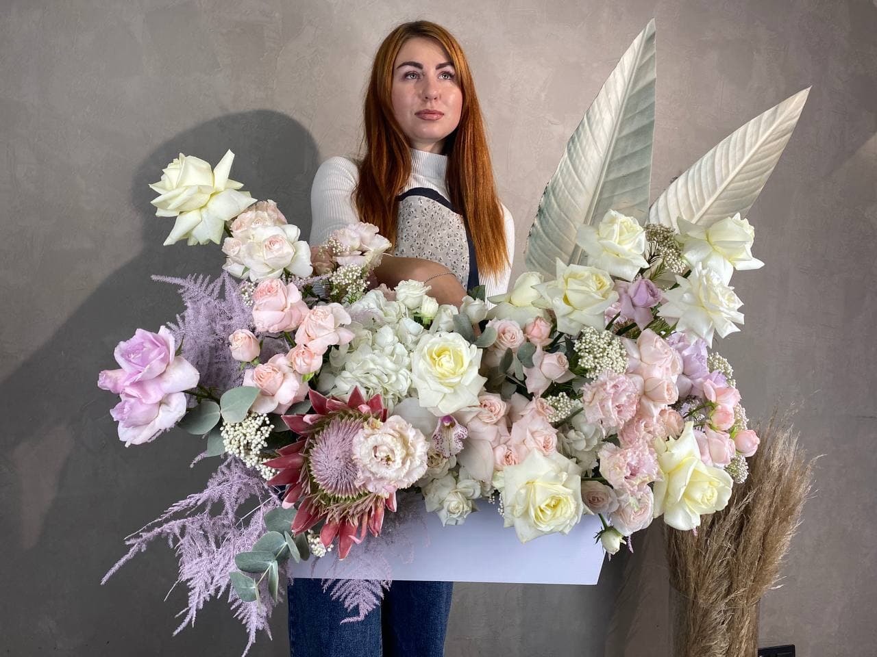 гортензия, розы, протея, озотамнус, орхидея, пионовидные кустовые розы различных сортов, эустома, листья стрелиции (или аналог), аспарагус, эвкалипт, деревянный бокс Готовая композиция может иметь незначительные внешние отличия от примера на фотографии, вместе с тем, сохранит гамму и фактуру.