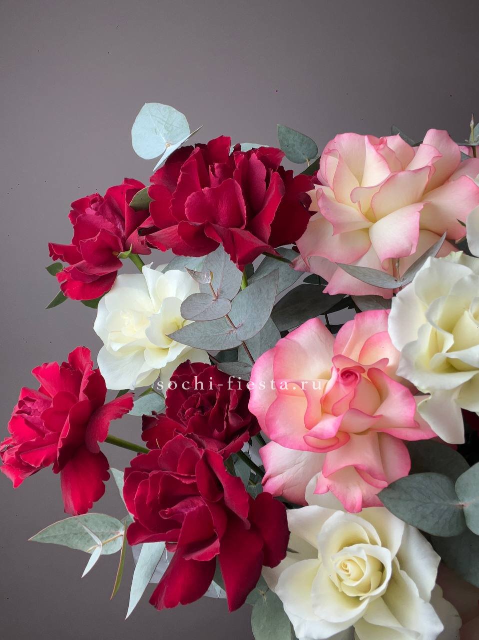 Одиннадцать вывернутых бутонов WhiteNice раскрываются волнами лепестков с матовым свечением. Эвкалипт добавляет воздуха между соцветиями.