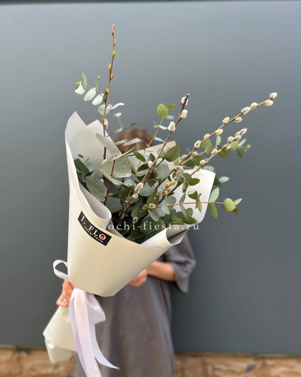 Белоснежные бутоны собраны в лаконичную форму с воздушной текстурой упаковки. Чистота линий и свежесть делают композицию универсальной для любого момента.