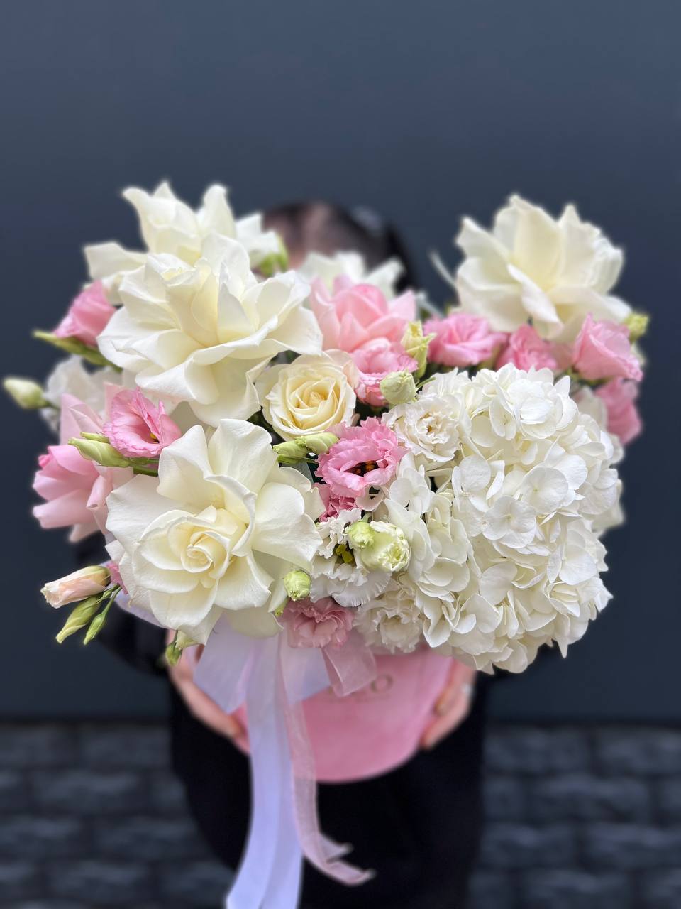 эустома, розы, пионовидные розы, озотамнус или аналог, диантусы, макаронс, декоративная зелень, коробка-сердце.