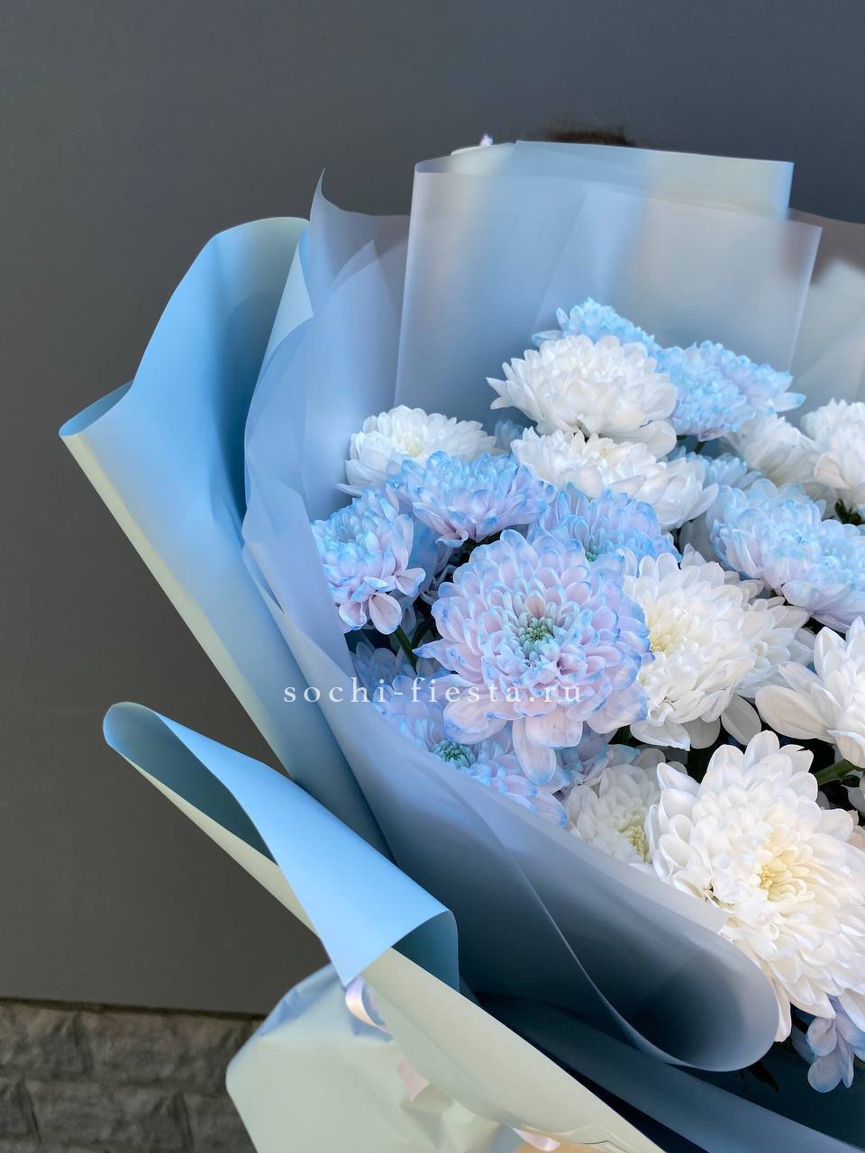 Девять кустов хризантемы в синих тонах собраны в плотную шапку. Каждый стебель несёт множество мелких соцветий, которые раскрываются постепенно. Такой букет сохраняет свежесть долго и радует насыщенным цветом.