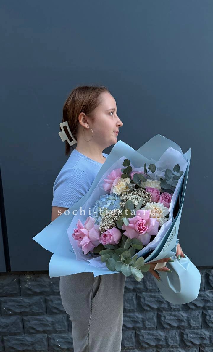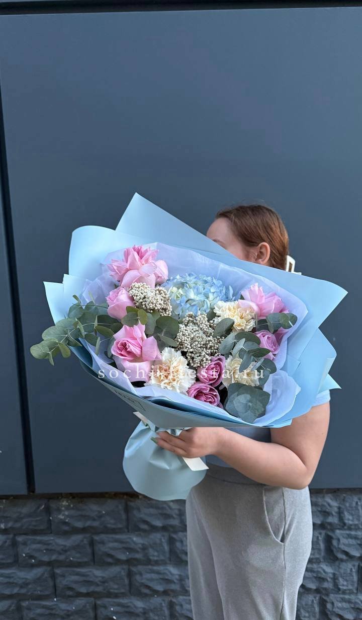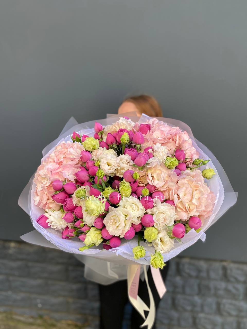 Мисти Баблс и гортензии в воздушной упаковке дарят ощущение свежести раннего утра. Лёгкая структура букета сохраняет форму и долго радует глаз.
