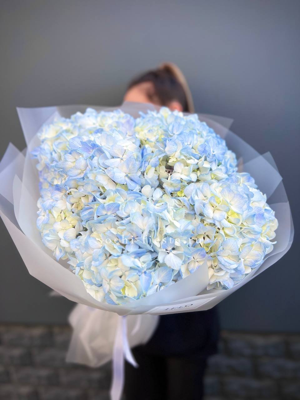 Одиннадцать кустовых хризантем окрашены в холодный голубой оттенок и собраны в плотную композицию. Каждая ветка раскрывается множеством бутонов, создавая объёмную шапку цвета зимнего неба.