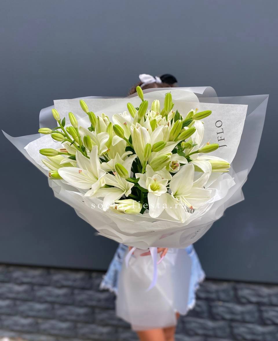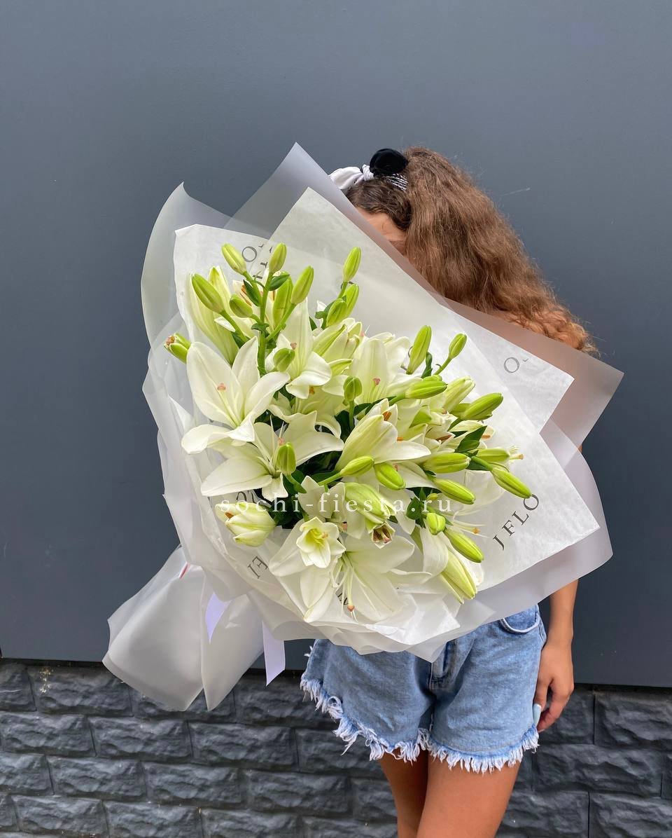Семь лилий собраны в лёгкую композицию с вертикальным силуэтом. Бутоны раскрываются постепенно и наполняют пространство свежим ароматом. Букет подходит для интерьеров в светлых тонах и создаёт ощущение простора.