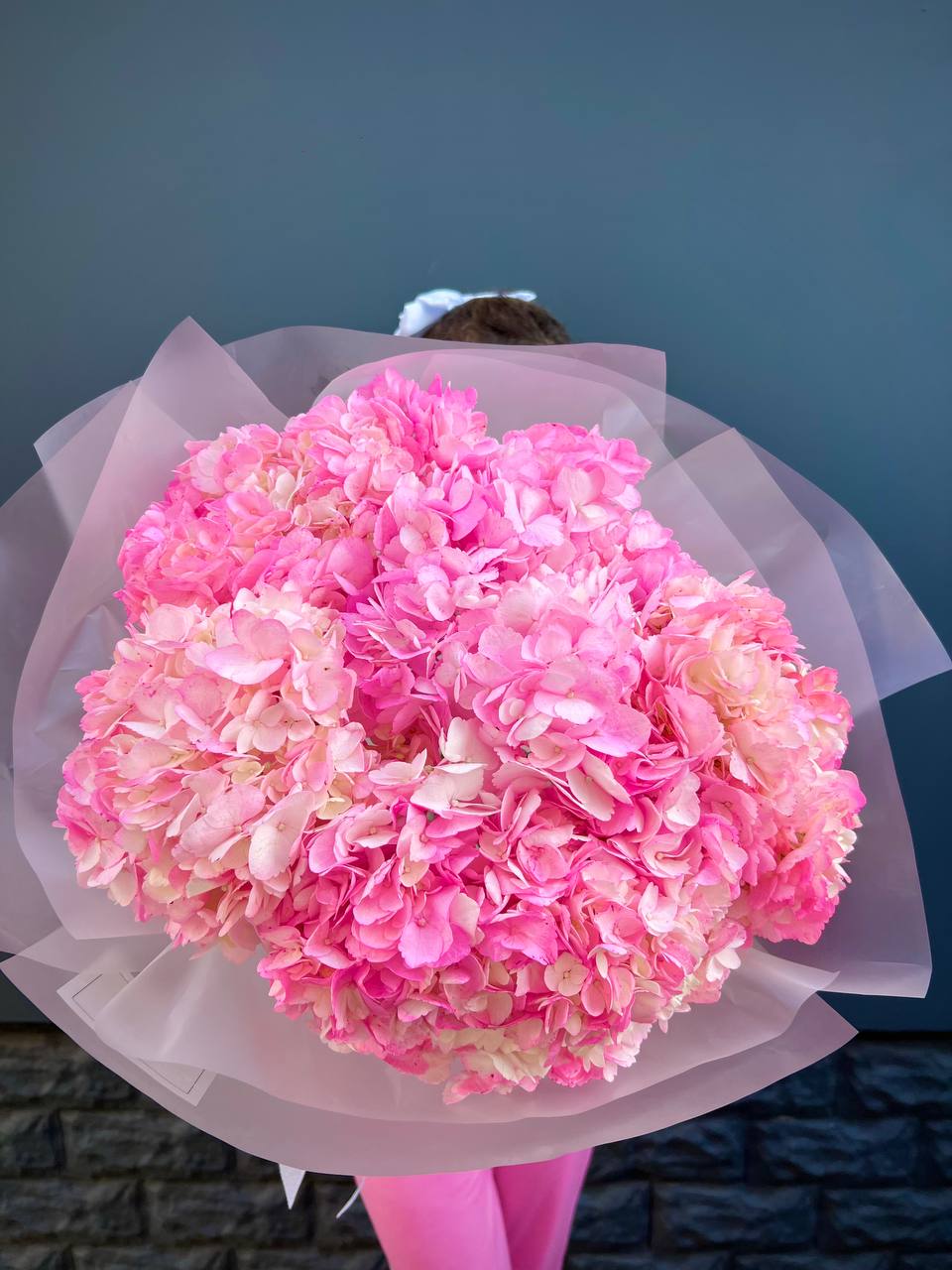 Пышные соцветия гортензии формируют плотное облако, которое занимает все пространство букета. Эустома добавляет воздушные акценты по краям композиции.