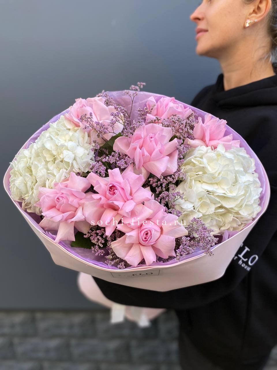 Розовая гамма раскрывается через махровые пионовидные бутоны и классические розы с плотной текстурой лепестков. Эвкалипт вплетается в композицию, создавая свежий акцент.
