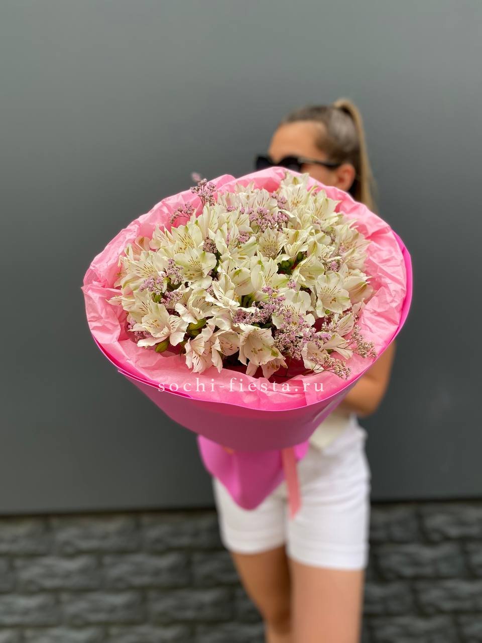 белые альстромерии - 11 шт., лимониум оформление.