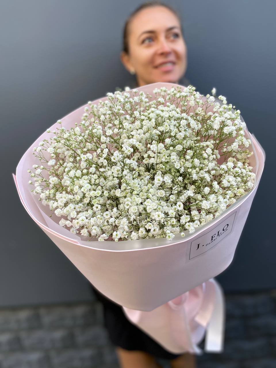 Семь веток голландской гипсофилы с россыпью мелких бутонов в воздушной композиции. Белоснежные соцветия создают ощущение простора и спокойствия.