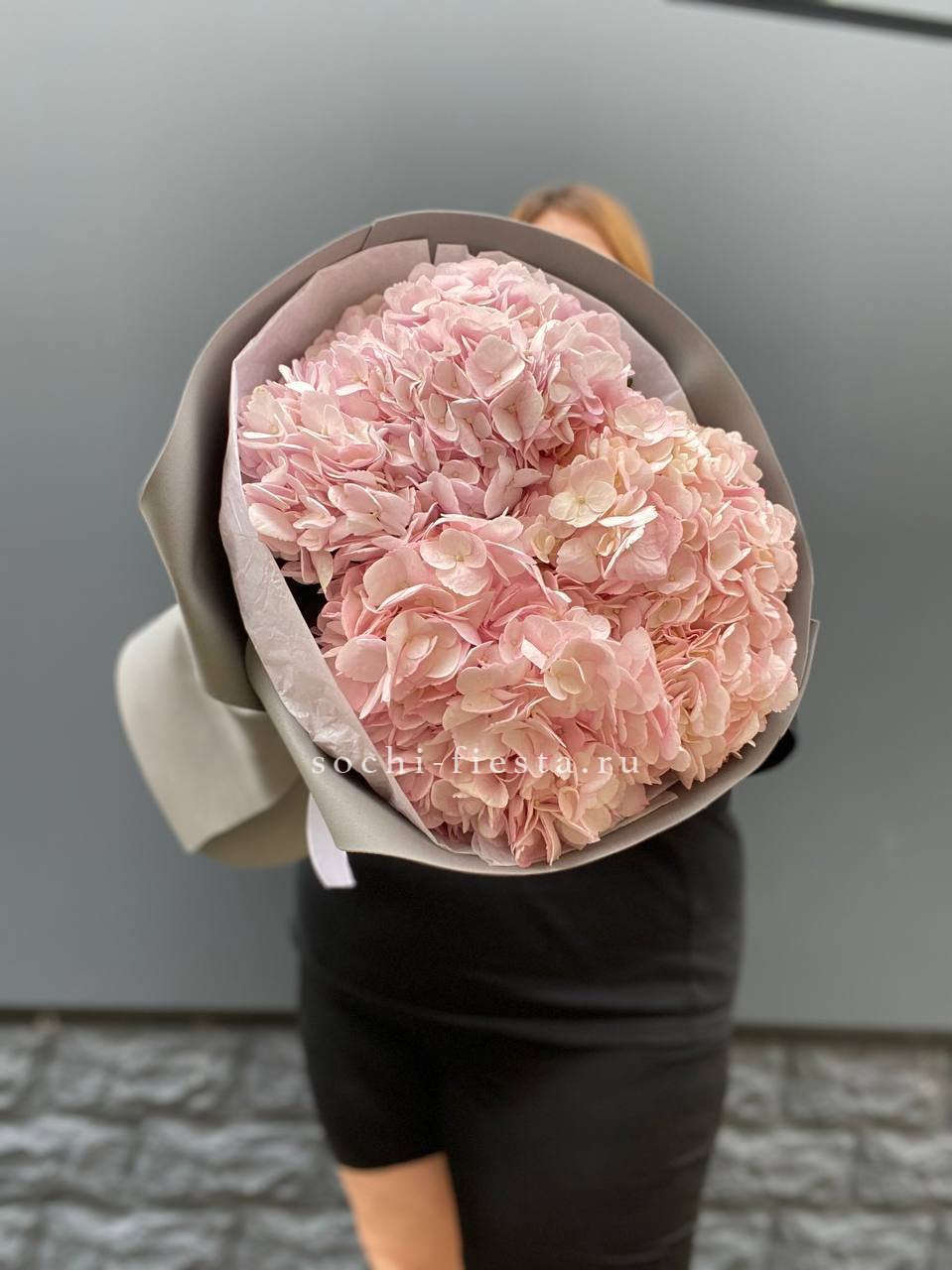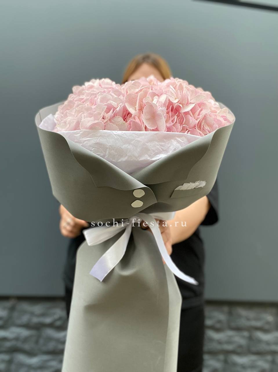гортензия, лента, зелень по наличию, дизайнерская упаковка.