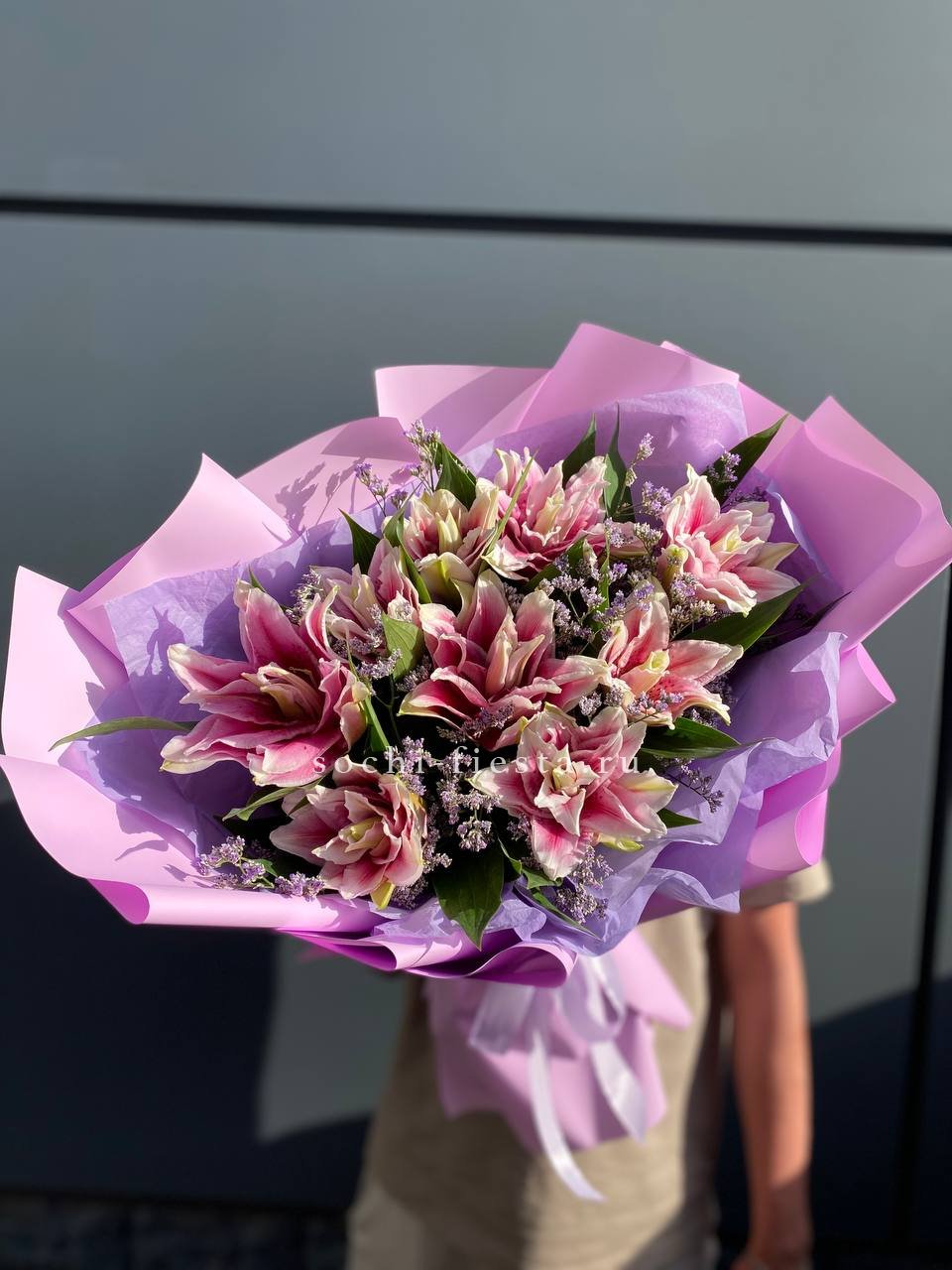 9 пионовидных лилий, лимониум, лента, авторская упаковка.