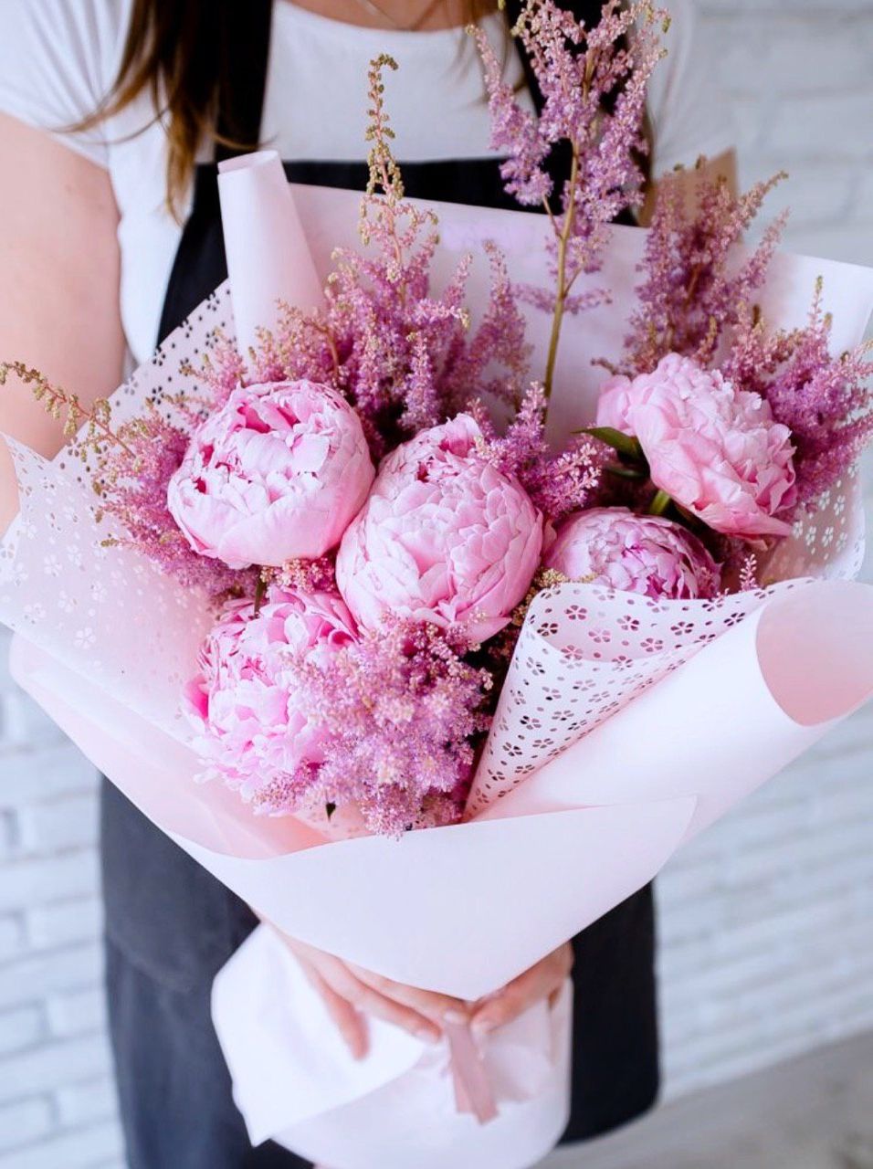 Пионы сорта Сара Бернар с их густыми лепестками и сиреневая дымка статицы образуют мягкий переход тонов. Композиция выглядит цельно и утончённо.