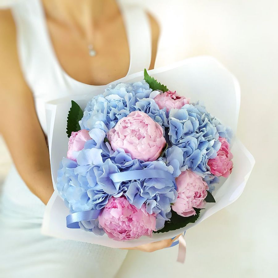 Гортензия и пионы образуют плотную текстуру с множеством лепестков. Букет собран так, что каждый бутон виден и дополняет общий ритм. Комбинированная упаковка завершает образ.