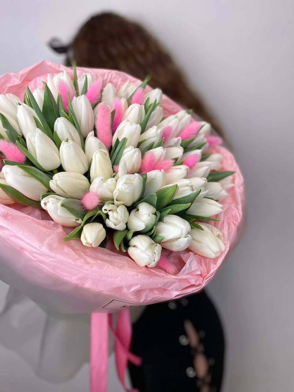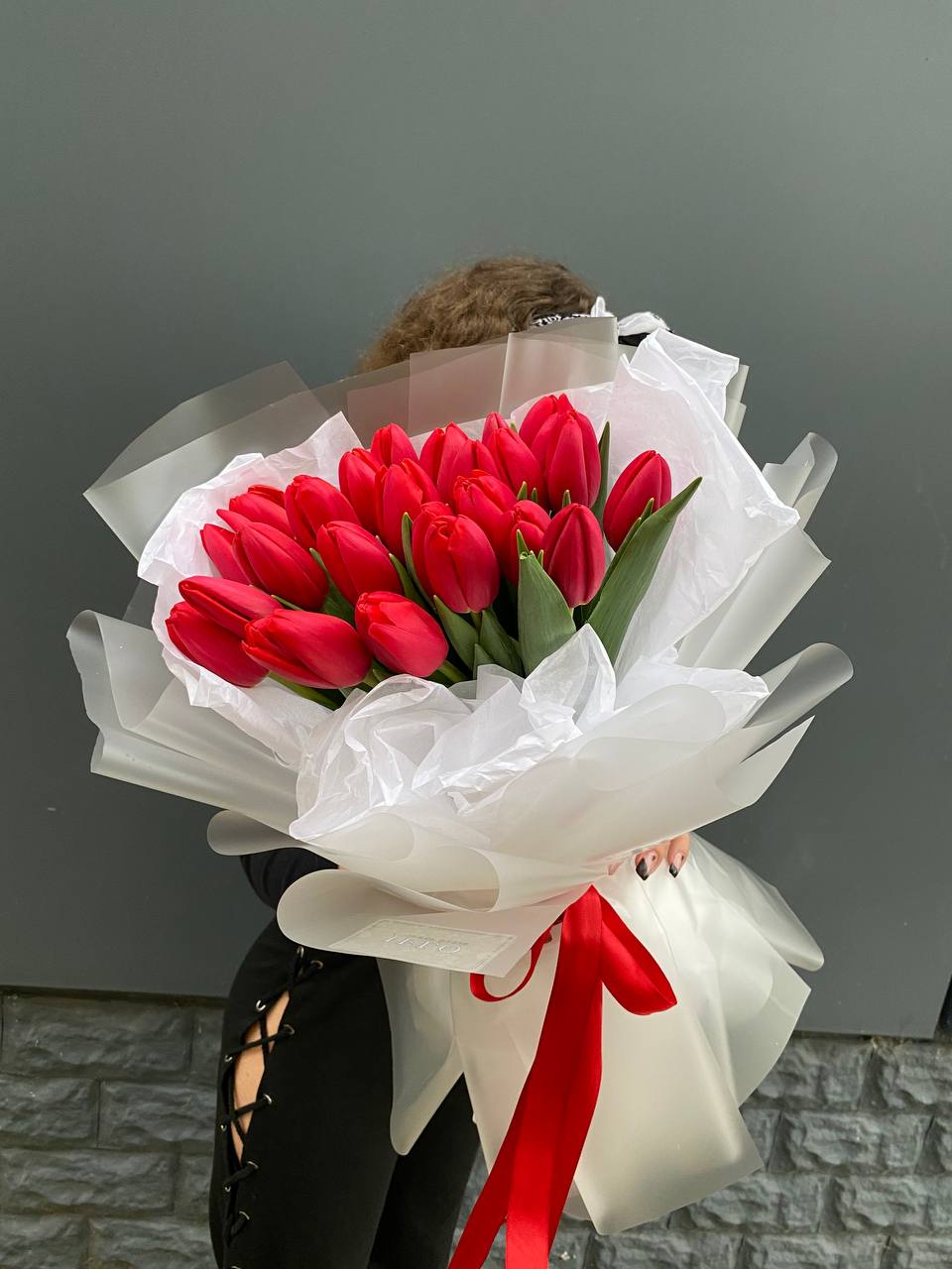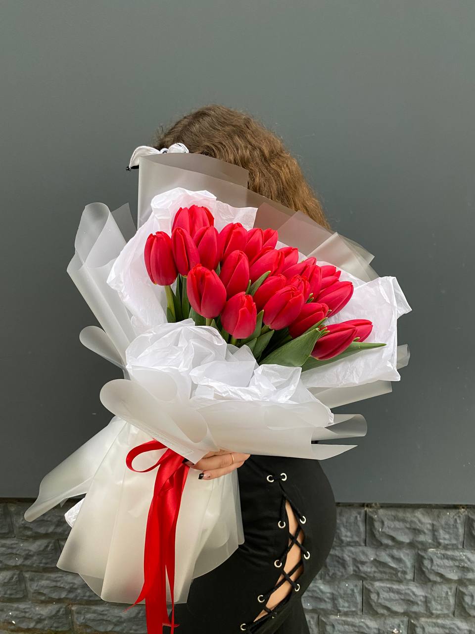 Одиннадцать тюльпанов в дизайнерском оформлении подойдут для весеннего жеста внимания. Цвет бутонов можно выбрать по вашему желанию.