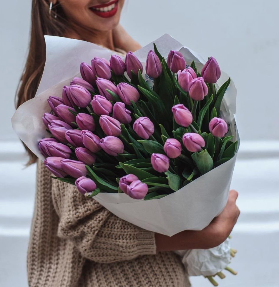 39 сиреневых тюльпанов, лента, дизайнерская пленка или крафт.