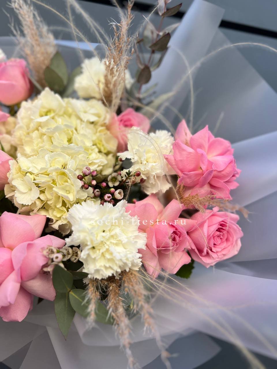 протея, роза кустовая, эустома, диантус, роза одноголовая, эвкалипт, озотамнус (по сезону) лента, дизайнерская упаковка.