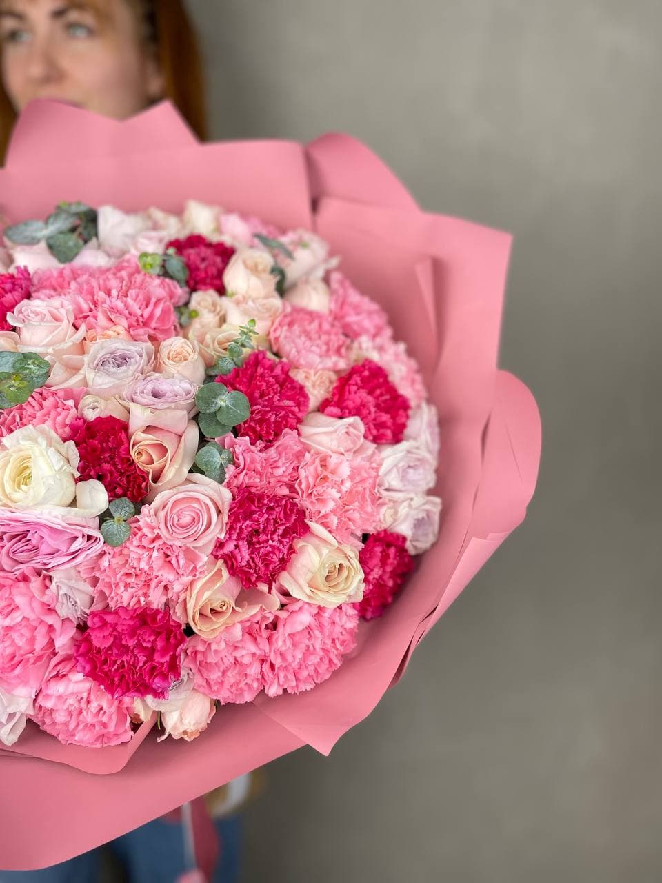 Протея задаёт графичный центр композиции, вокруг которого раскрываются розы и воздушная эустома. Диантус добавляет текстурные пятна, а эвкалипт смягчает линии. Букет с характером и выразительной архитектурой.