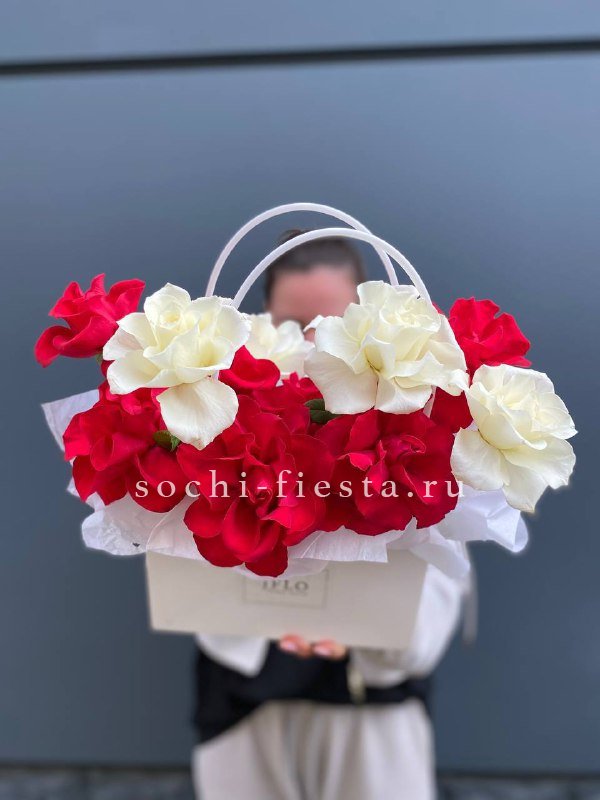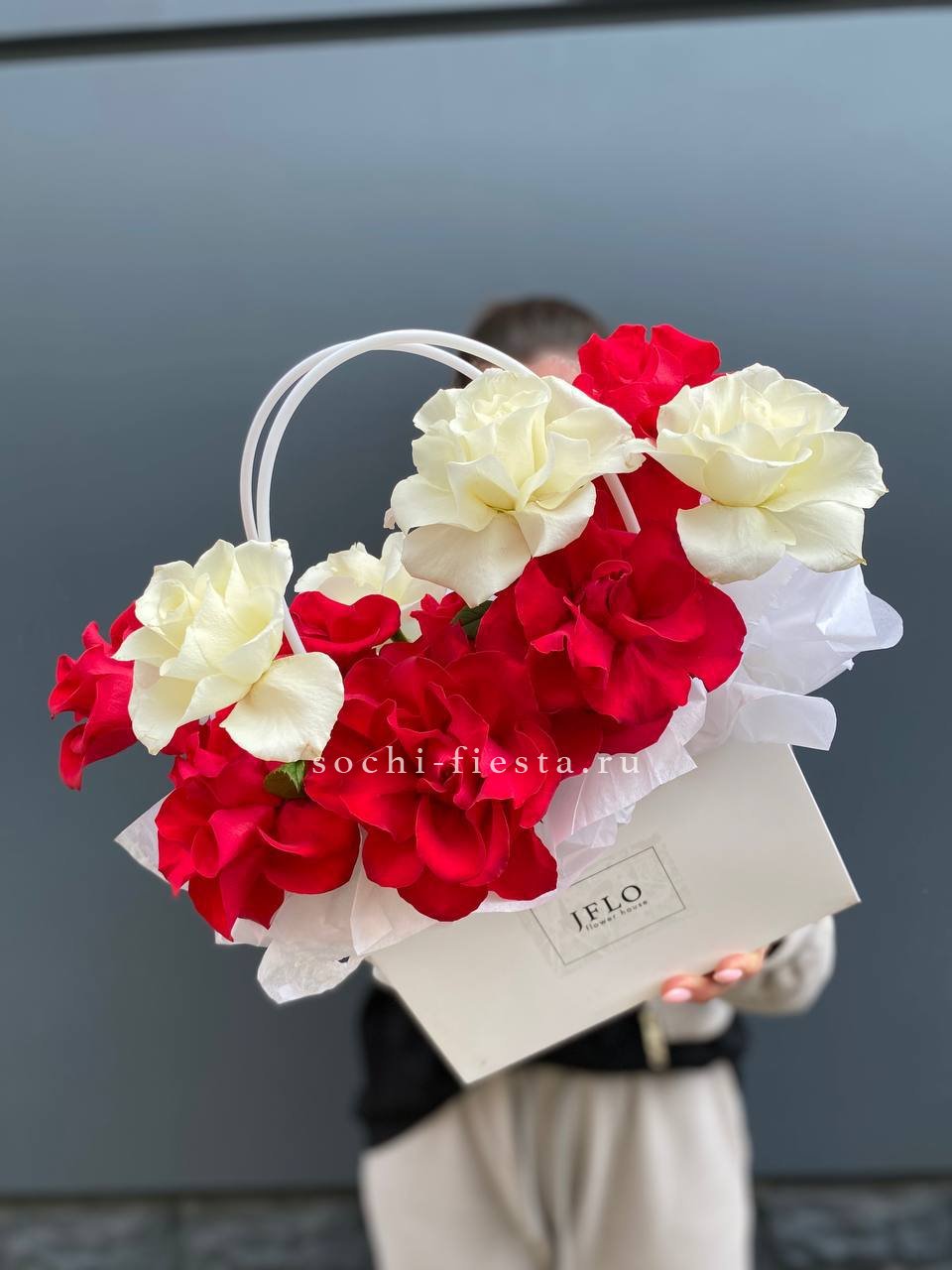 Красные тюльпаны переплетаются с розами в динамичной композиции, где весенняя лёгкость встречается с классической формой. Два цветка в одном букете создают визуальную глубину и живой ритм.