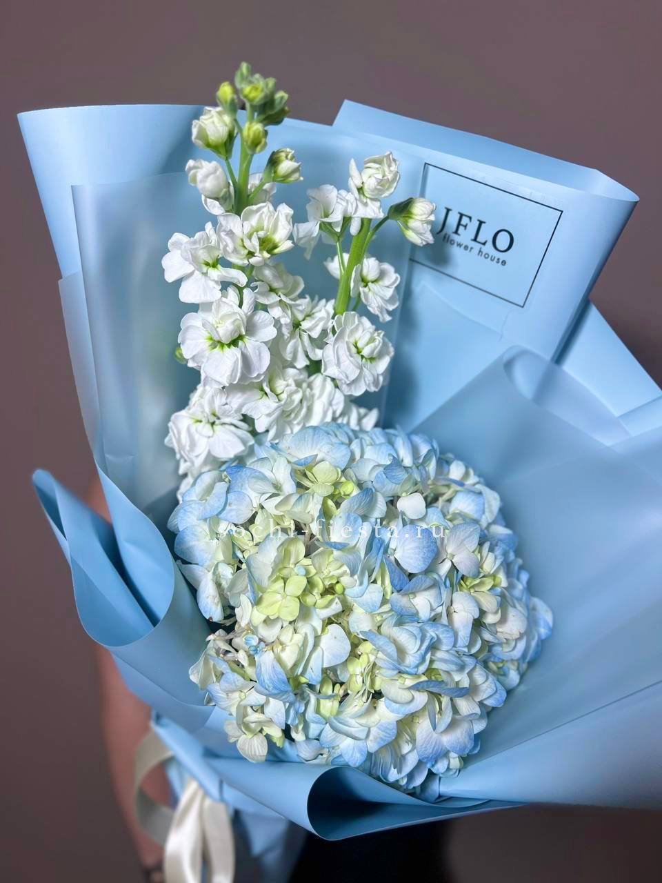 голубая гортензия, маттиола или замена в голубом оформлении.