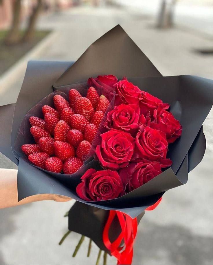 300-400г. ароматной клубники, розы- 9шт., лента, оформление.