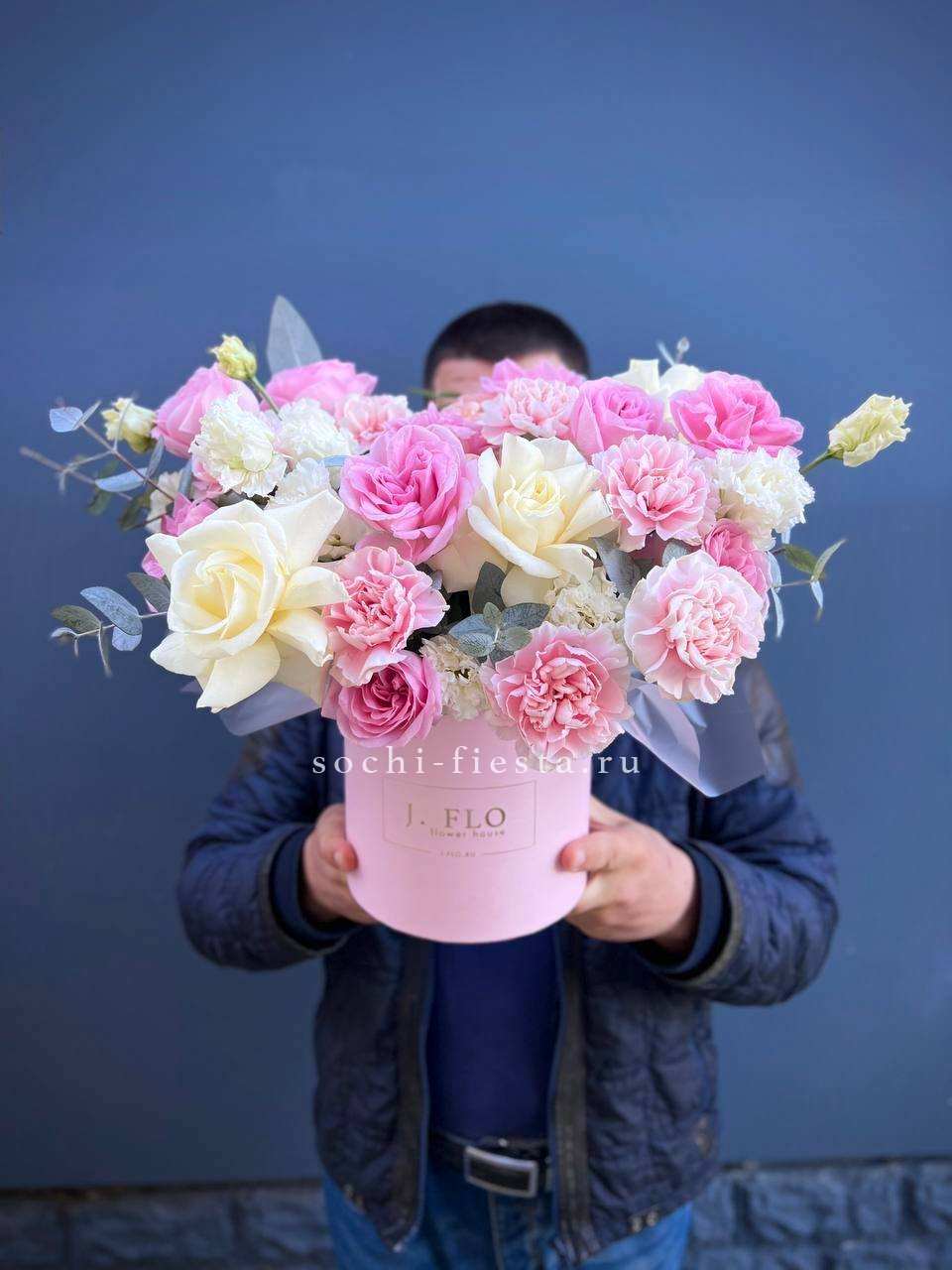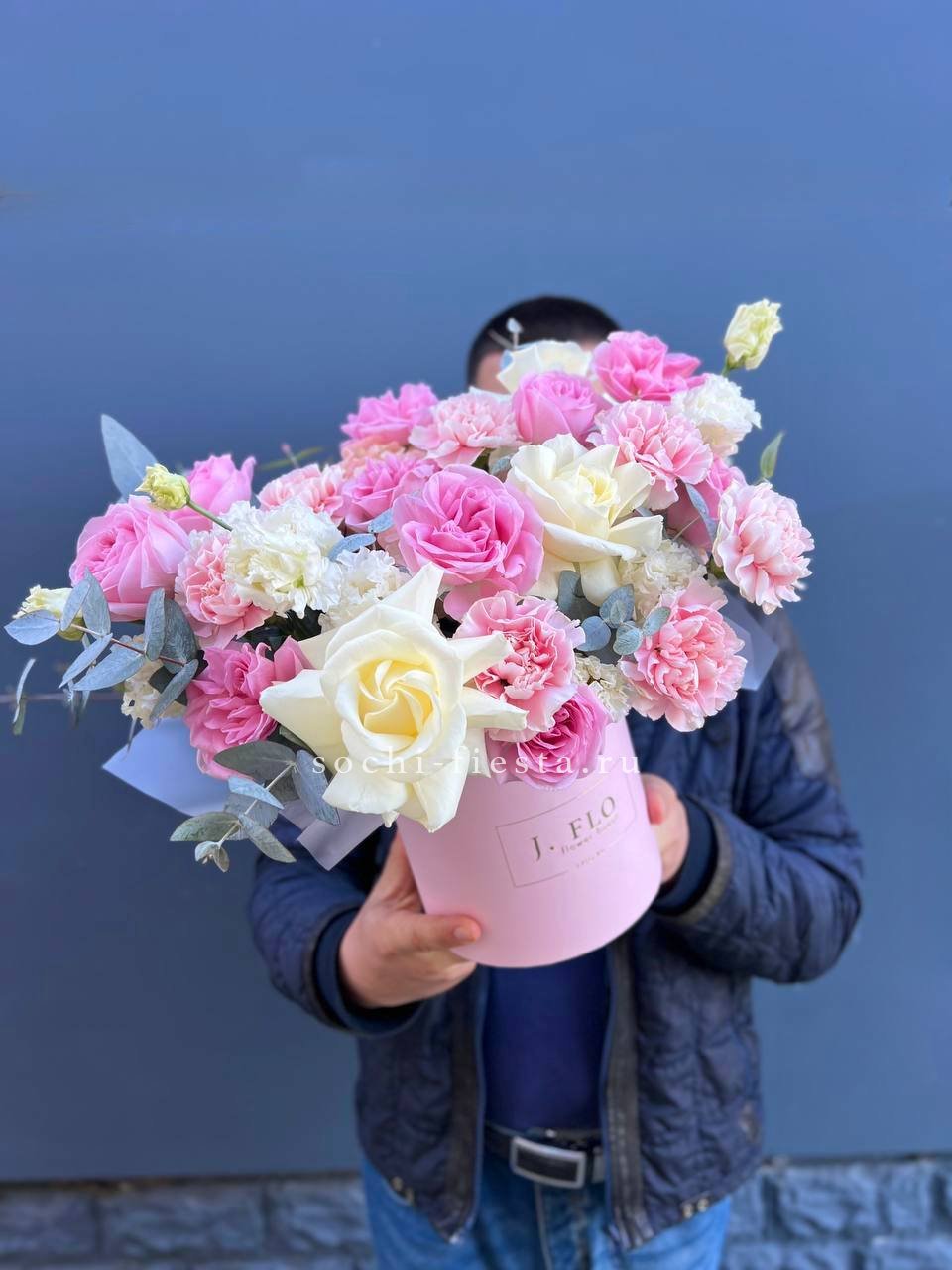 Белые розы и эустомы перекликаются с пастельными соцветиями гортензии, а озотамнус добавляет фактурные акценты. Эвкалипт обрамляет композицию серебристыми нотами.