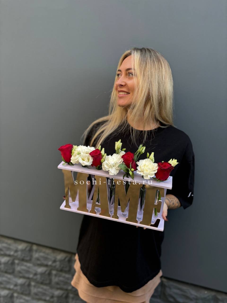 розы, диантусы, эустома, деревянный ящик с колбами.