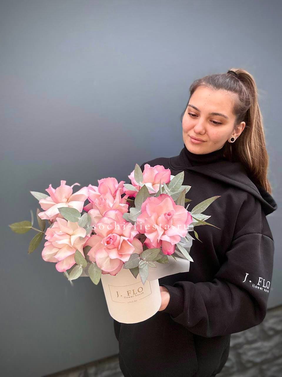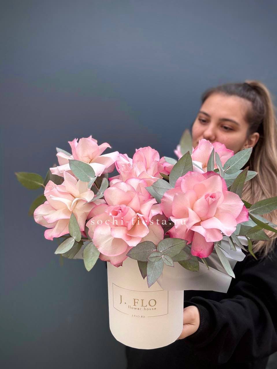 гортензии, эустома, розы, бомбастик, эвкалипт, антиринум в боксе 25.