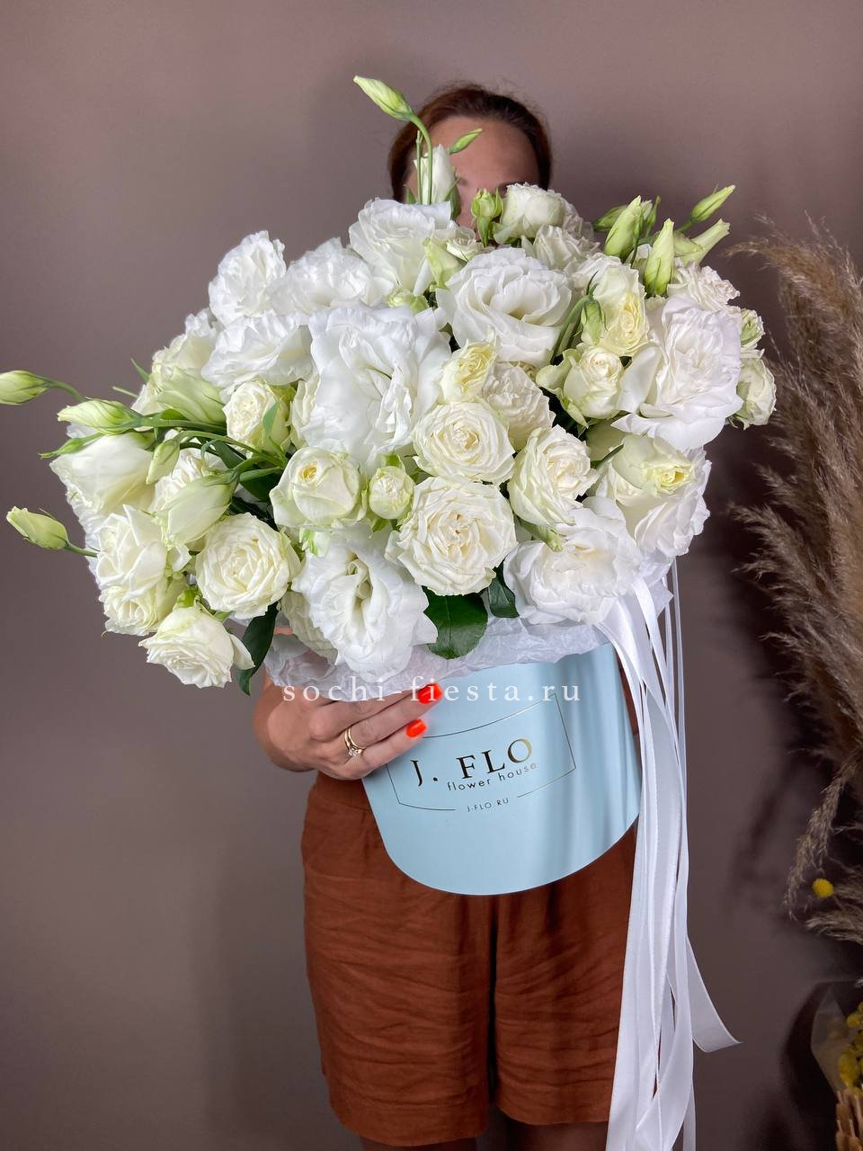 пионовидная кустовая роза бомбастик, эустома, лента, цилиндр D20.