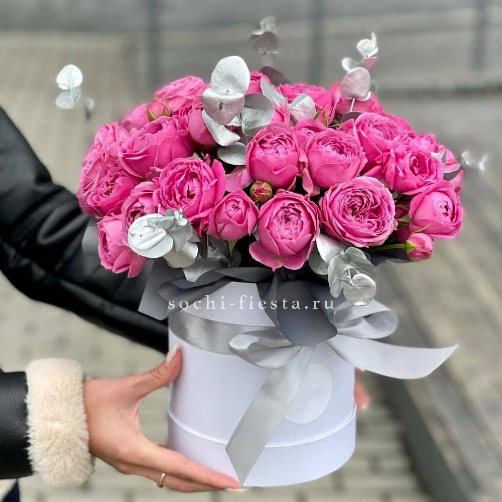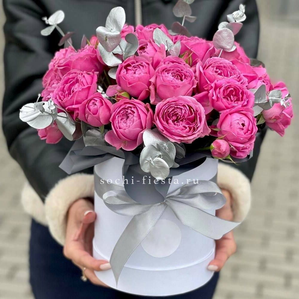пионовидная кустовая роза бомбастик - 31 веточек, эвкалипт, лента, цилиндр D20.