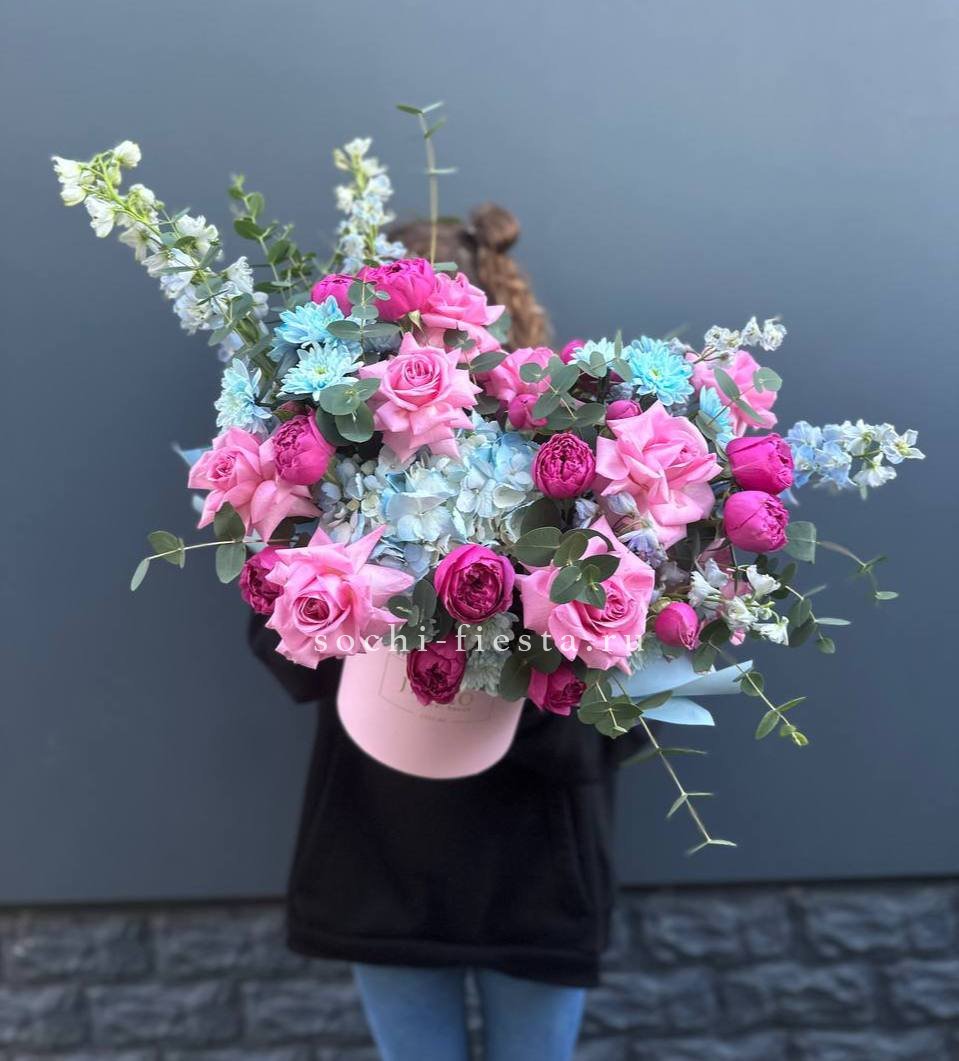 Сиреневая гамма раскрывается слоями от светлых до насыщенных тонов. Композиция заполняет пространство мягким цветом и создаёт воздушное впечатление в просторной коробке.
