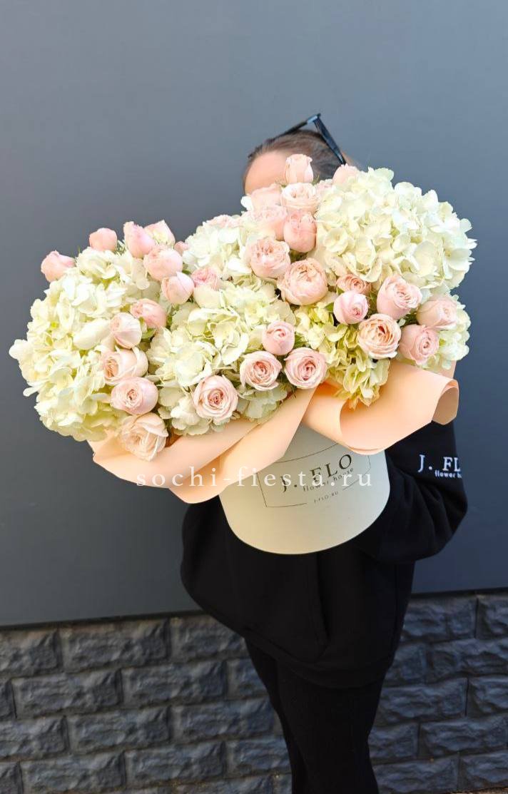 роза, диантус, пионы или гортензия, розы, бомбастик, эустома, декоративная зелень, цилиндр D16.
