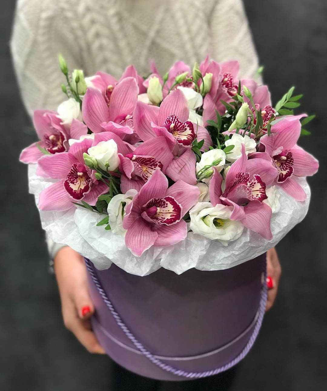 Орхидея и эустома в шляпной коробке