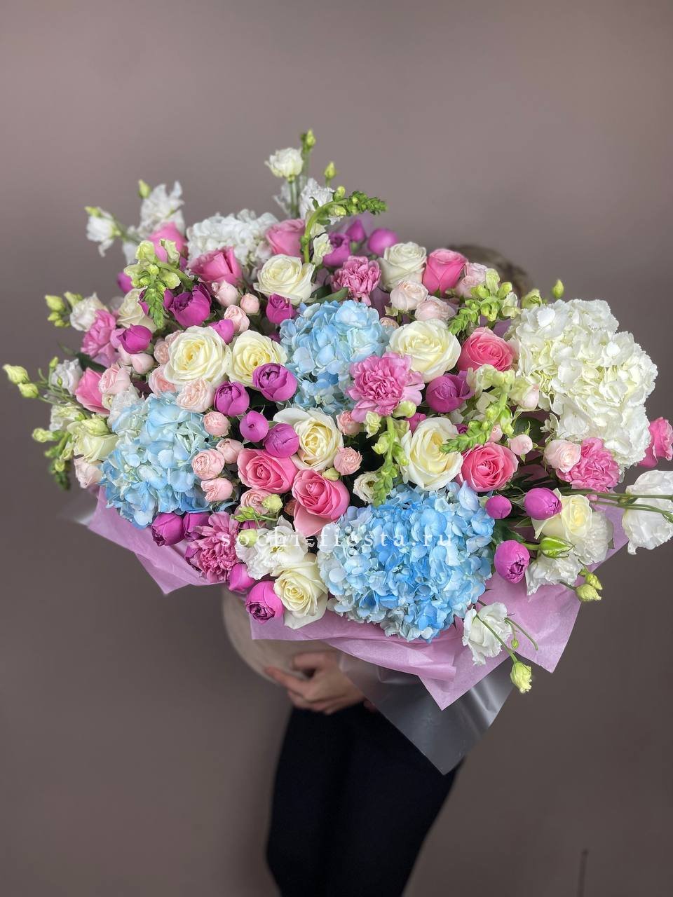 гортензия, диантус, бомбастик, мисти баблс, розы, антиринум, эустома, бокс гигант.