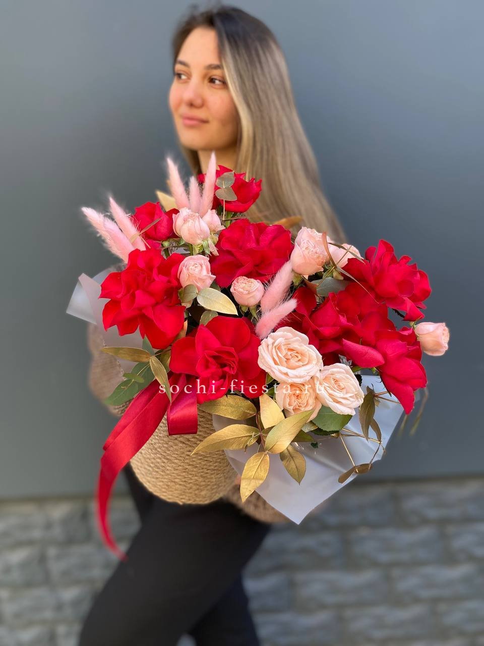 Красные розы и бомбастик выделяются на фоне золотистого эвкалипта и пушистого лагуруса. Тёплая гамма и разнообразие текстур собраны в компактную композицию с выразительным характером.