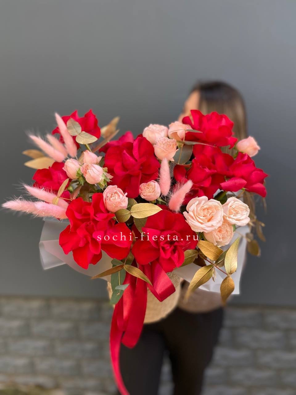 Мягкая палитра белых оттенков с вкраплениями диантуса создает воздушную композицию в натуральном джутовом кашпо. Кустовые розы добавляют объем, а эвкалипт завершает природную гармонию. Готовое решение для интерьера в спокойных тонах.