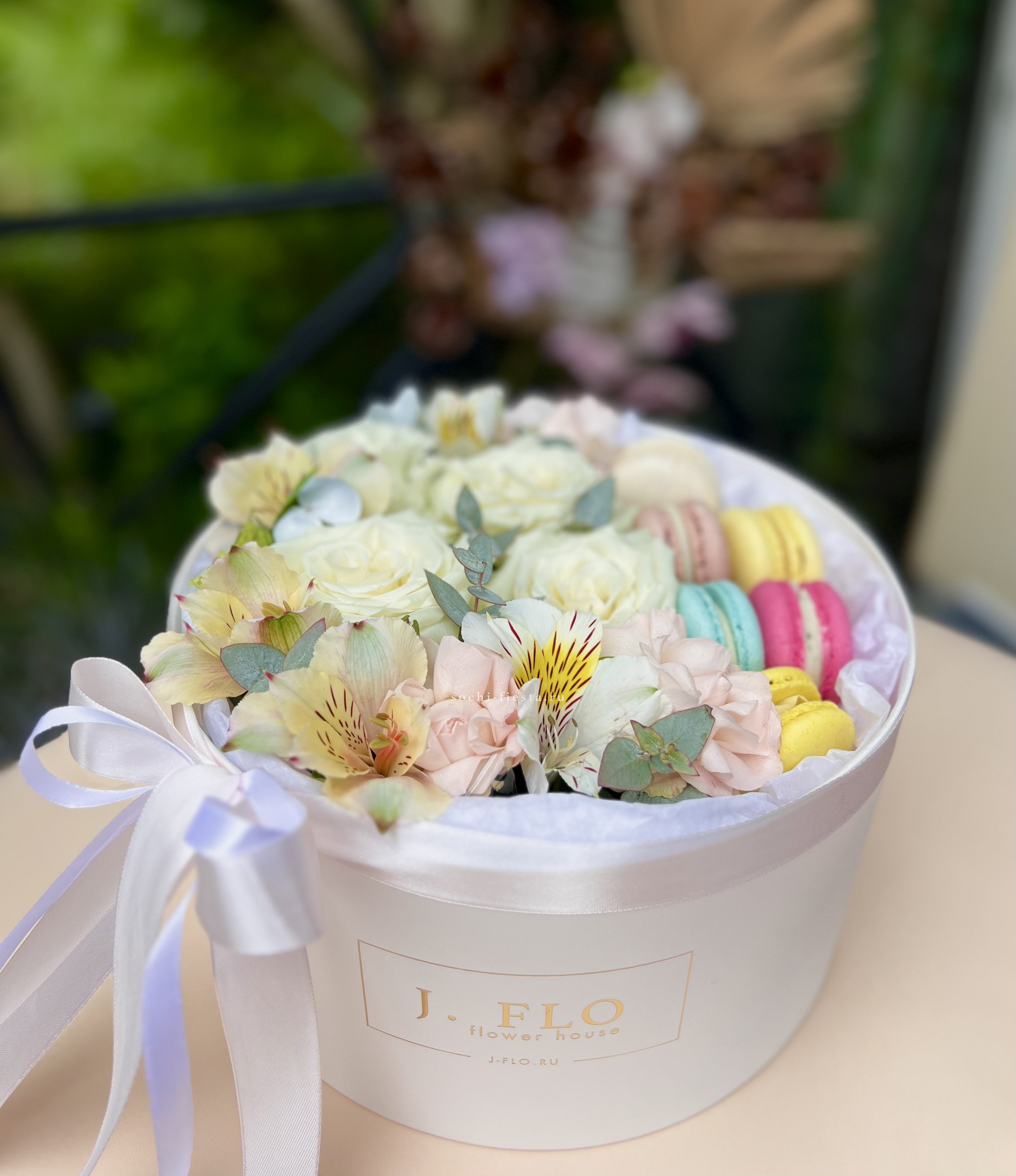Пионовидные розы Мисти Баблс раскрываются пышными головками рядом с воздушной эустомой. Бархатистые лепестки создают объёмную текстуру, а макаронс добавляют сладкий акцент.