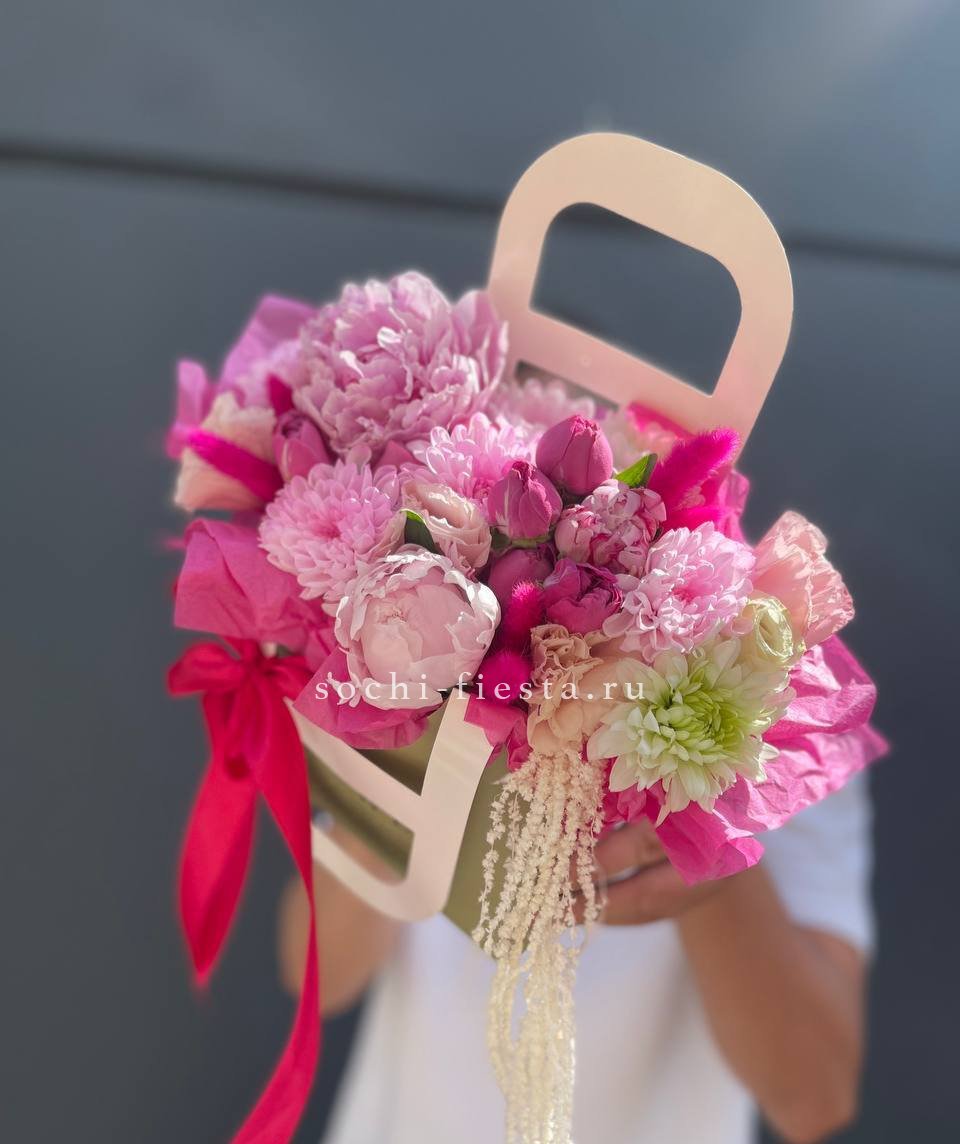 Пионы раскрываются среди кустовых роз и хризантем, а лагурус добавляет мягкие текстурные акценты. Сумка-кашпо с лентой удерживает форму и позволяет композиции сохранять объем. Сезонное сочетание с природной гармонией.