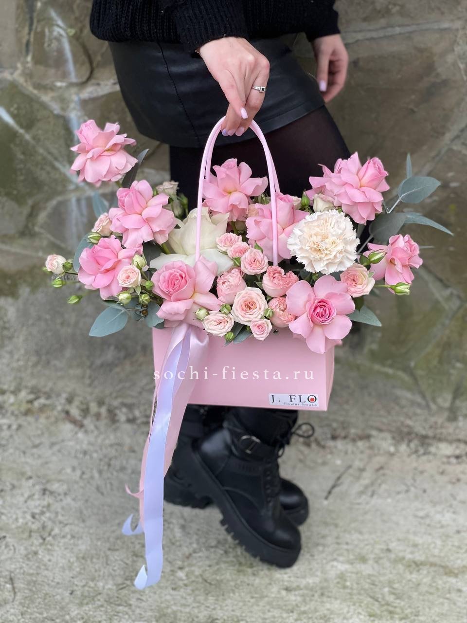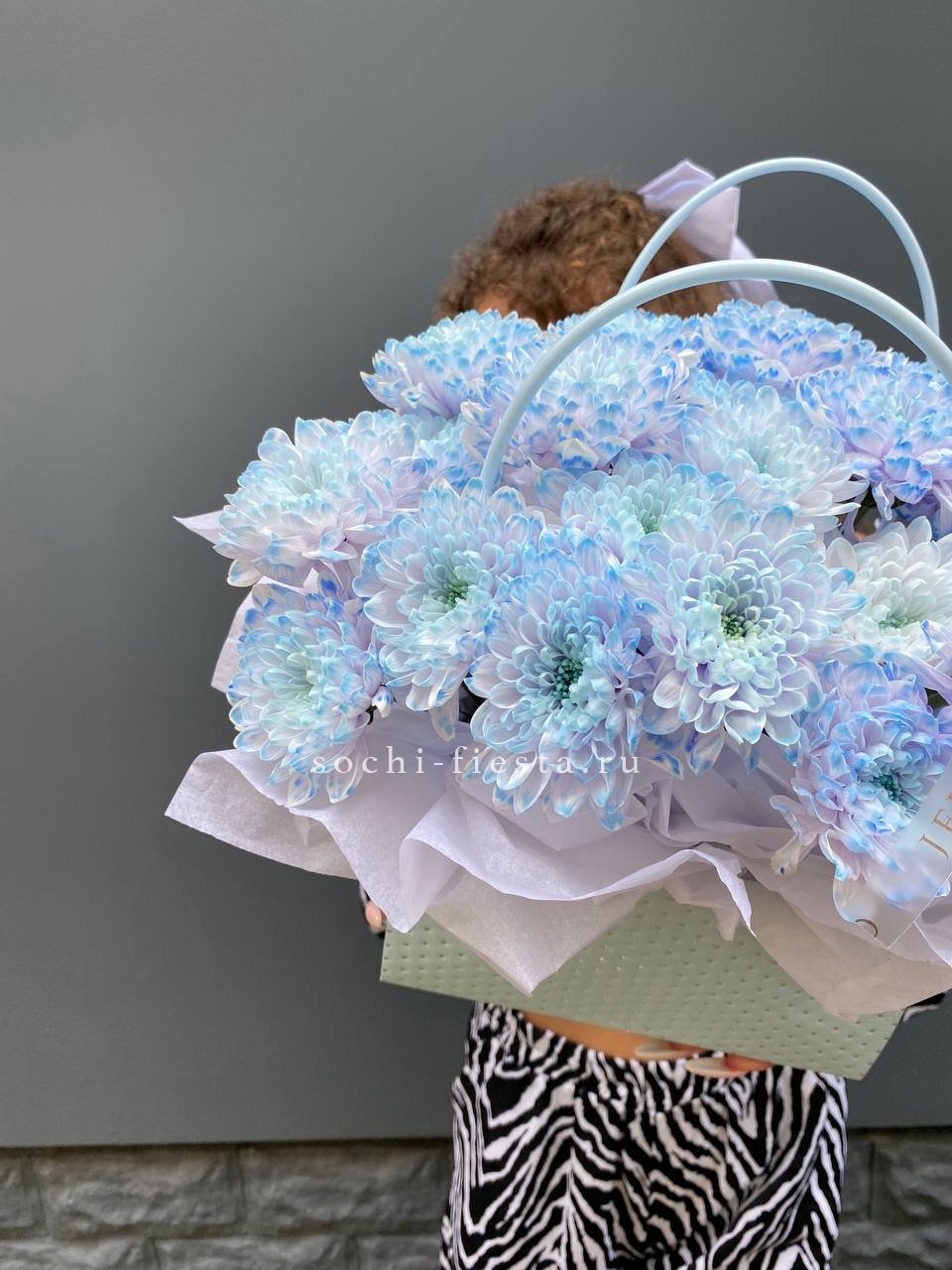 Хризантемы с пушистыми коробочками хлопка создают теплую домашнюю композицию в удобной сумочке. Цветы долго радуют взгляд и не требуют сложного ухода. Формат подходит для размещения в любом уголке дома.