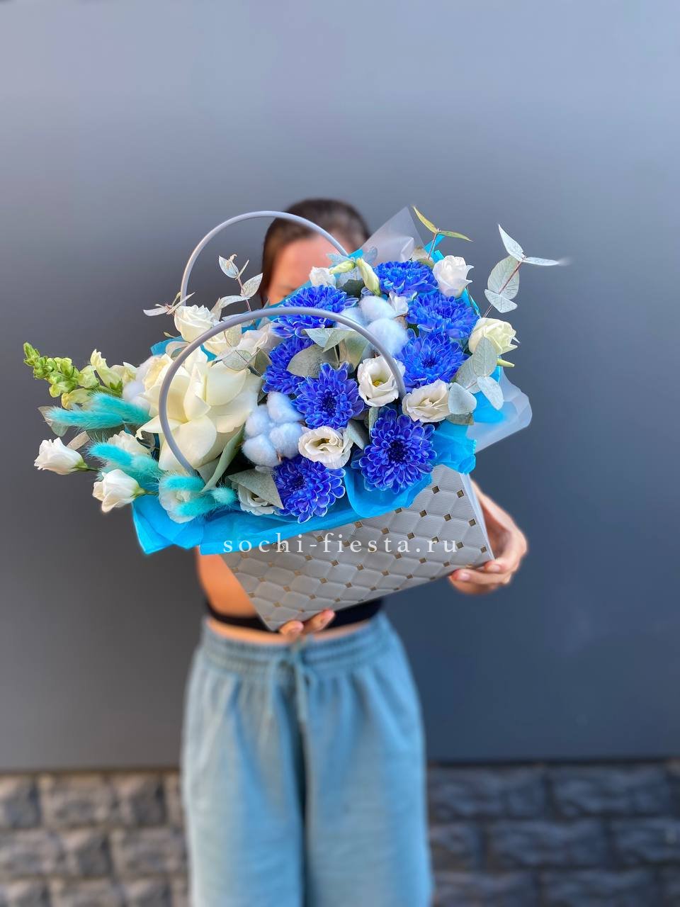 хризантема кустовая, лента, сумка-кашпо.