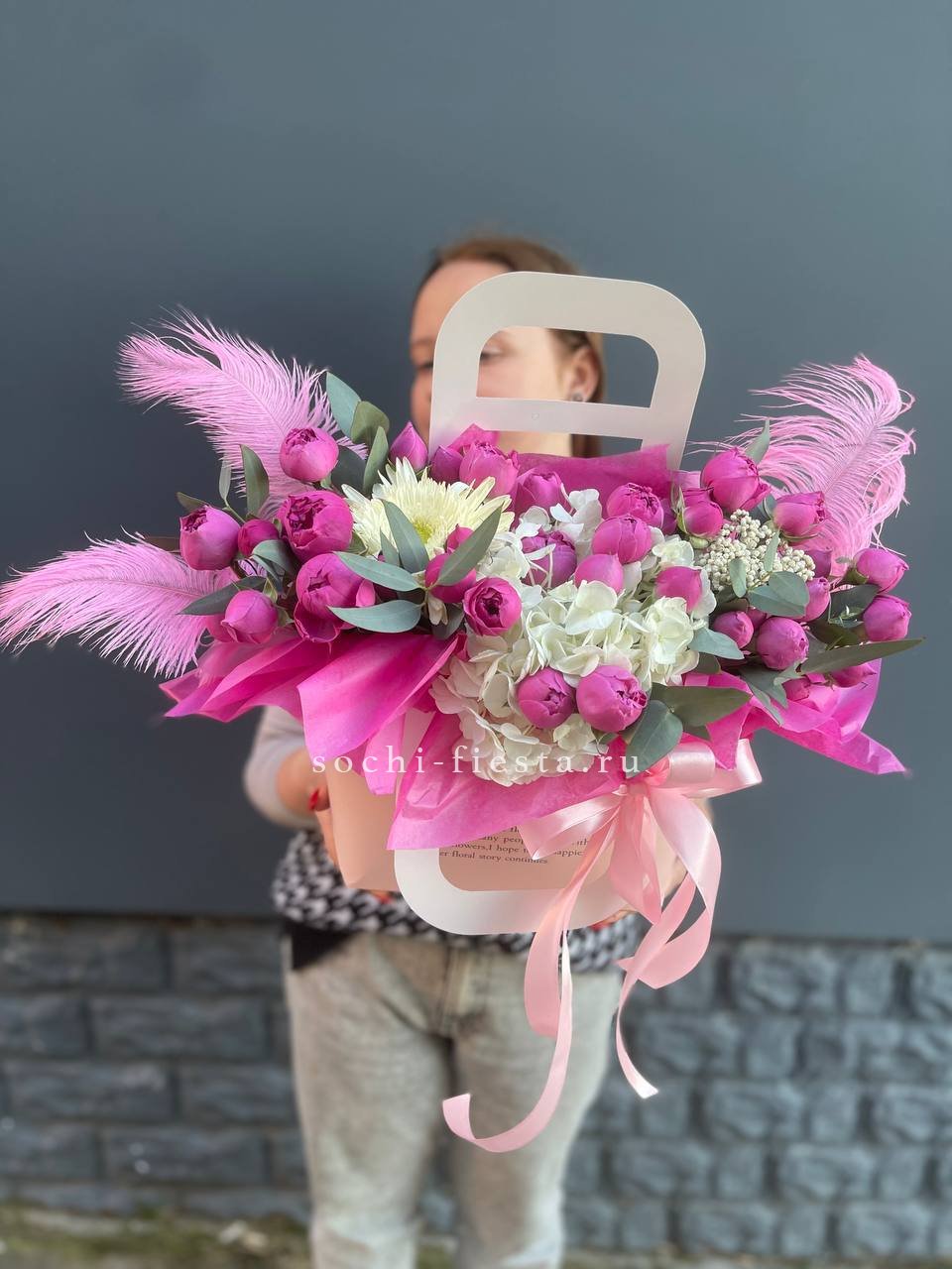 Воздушные головки диантусов собраны в компактную форму с мягкими переходами оттенков. Эвкалипт добавляет свежести и завершает композицию в удобной сумочке.