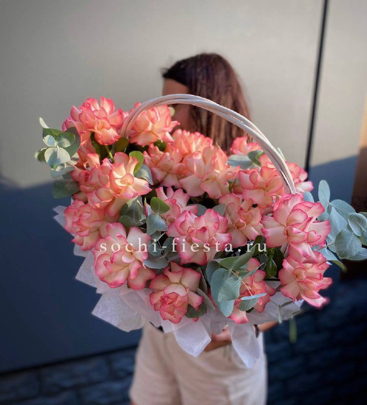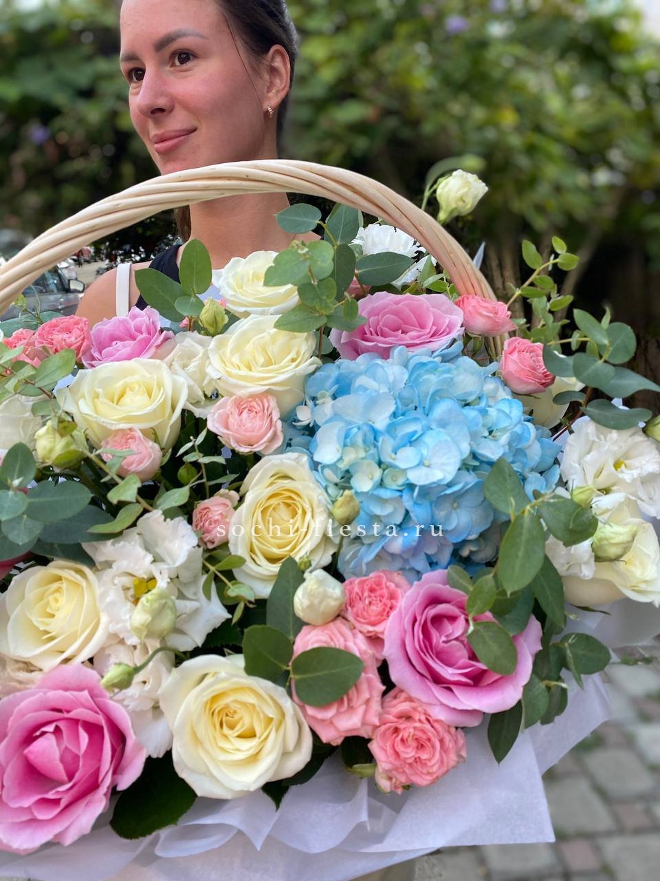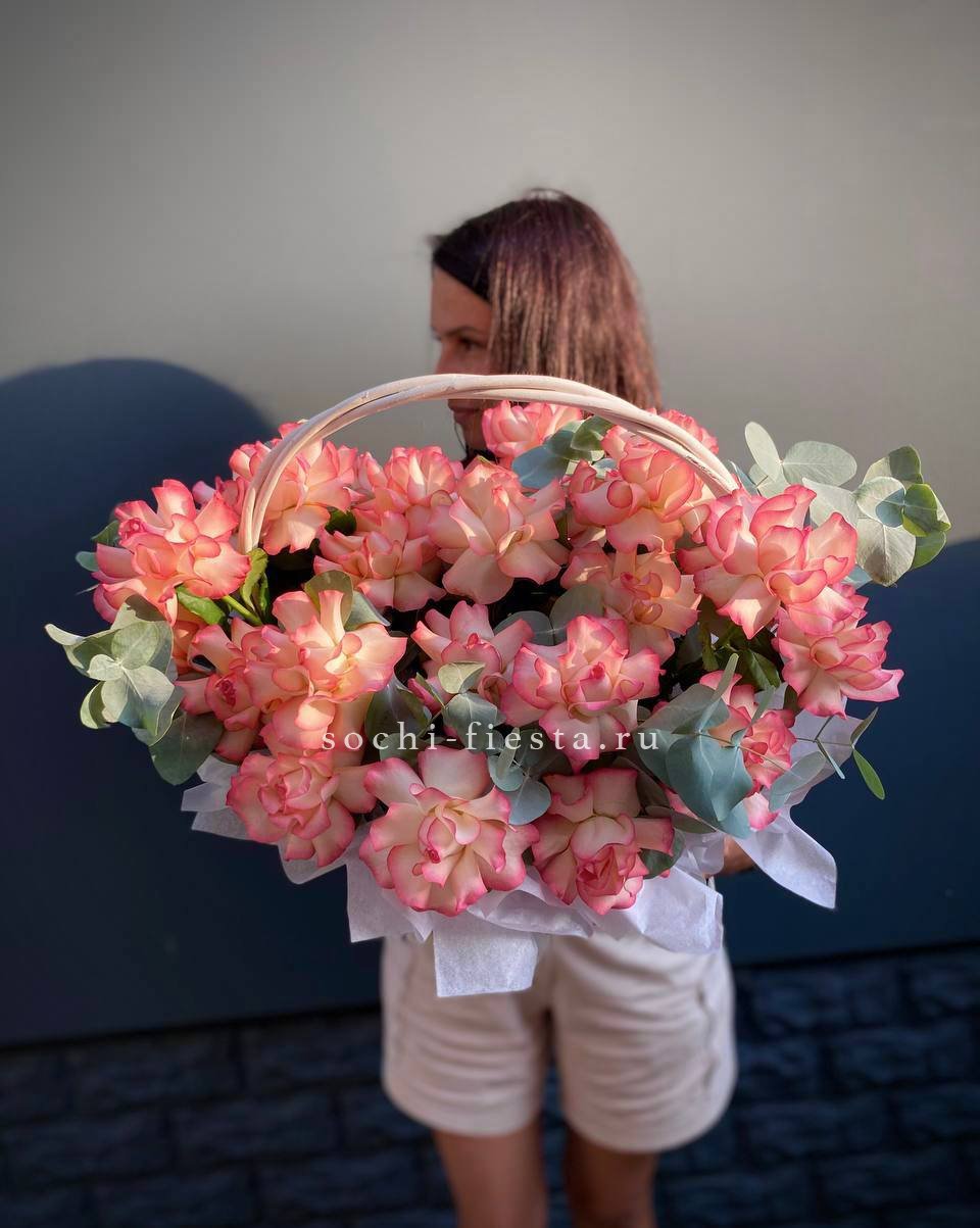 розы, эустома, гортензия, бомбастик, маттиола ( или аналог), эвкалипт, корзина.