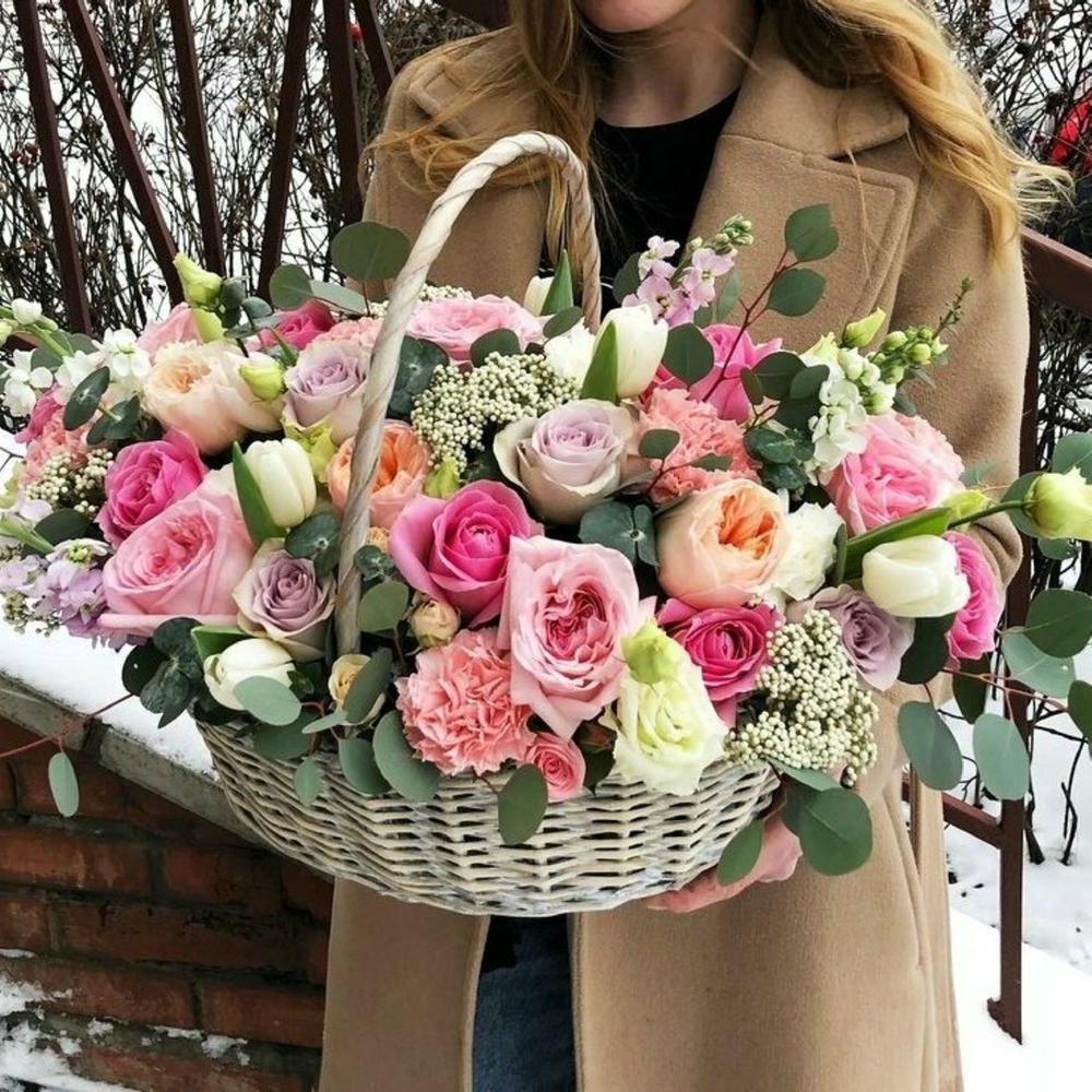 Пышная корзина с розами и гортензией раскрывается мягкими переходами розовых тонов. Эустома и диантус добавляют воздушности, а эвкалипт создает свежую основу для многослойной композиции. Авторская работа для важных событий и значимых встреч.