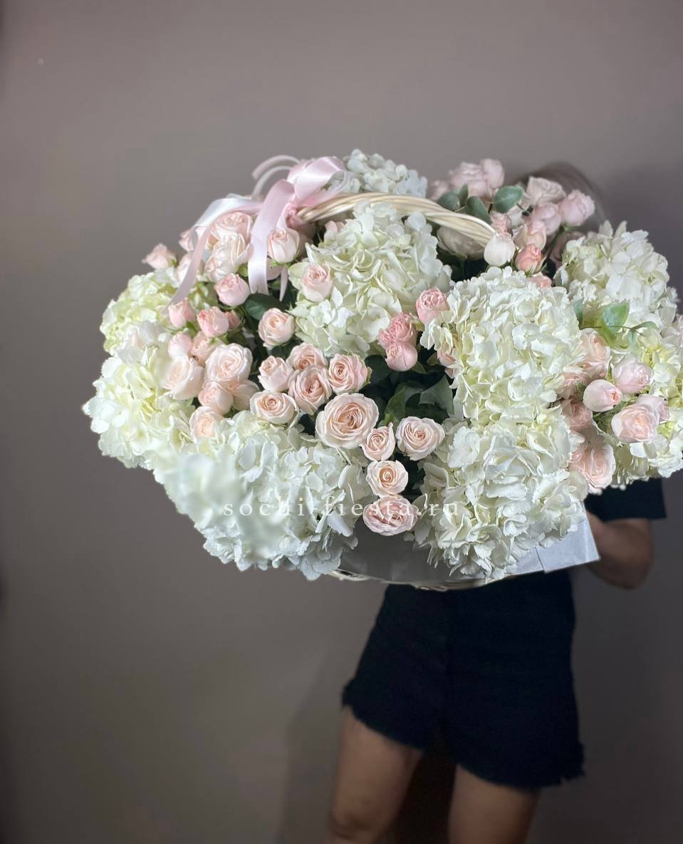 маттиола, гортензии, кустовые розы, розовые розы в корзине.