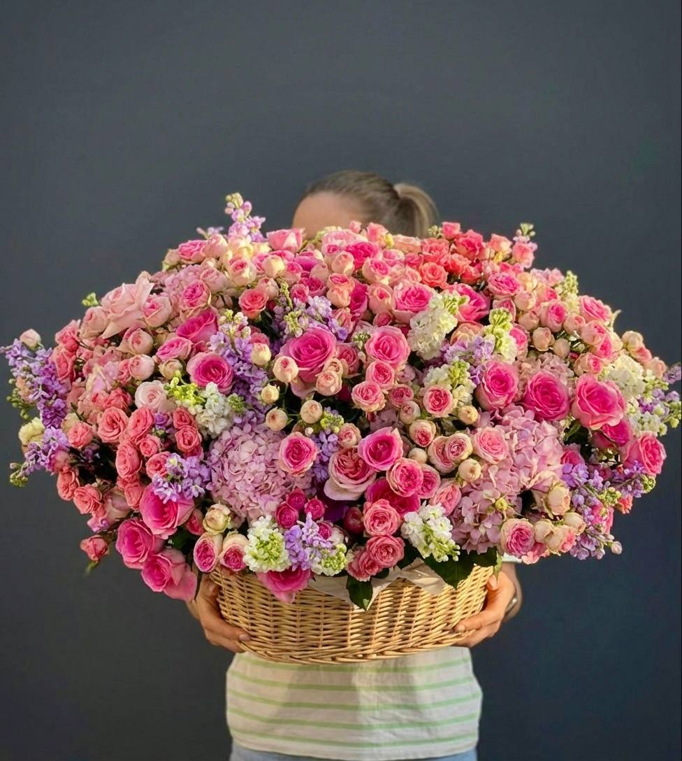 Широкая корзина вмещает пышную композицию из гортензий, эустом и пионовидных роз. Цветы располагаются свободно, создавая впечатление садовой клумбы, перенесенной в интерьер.