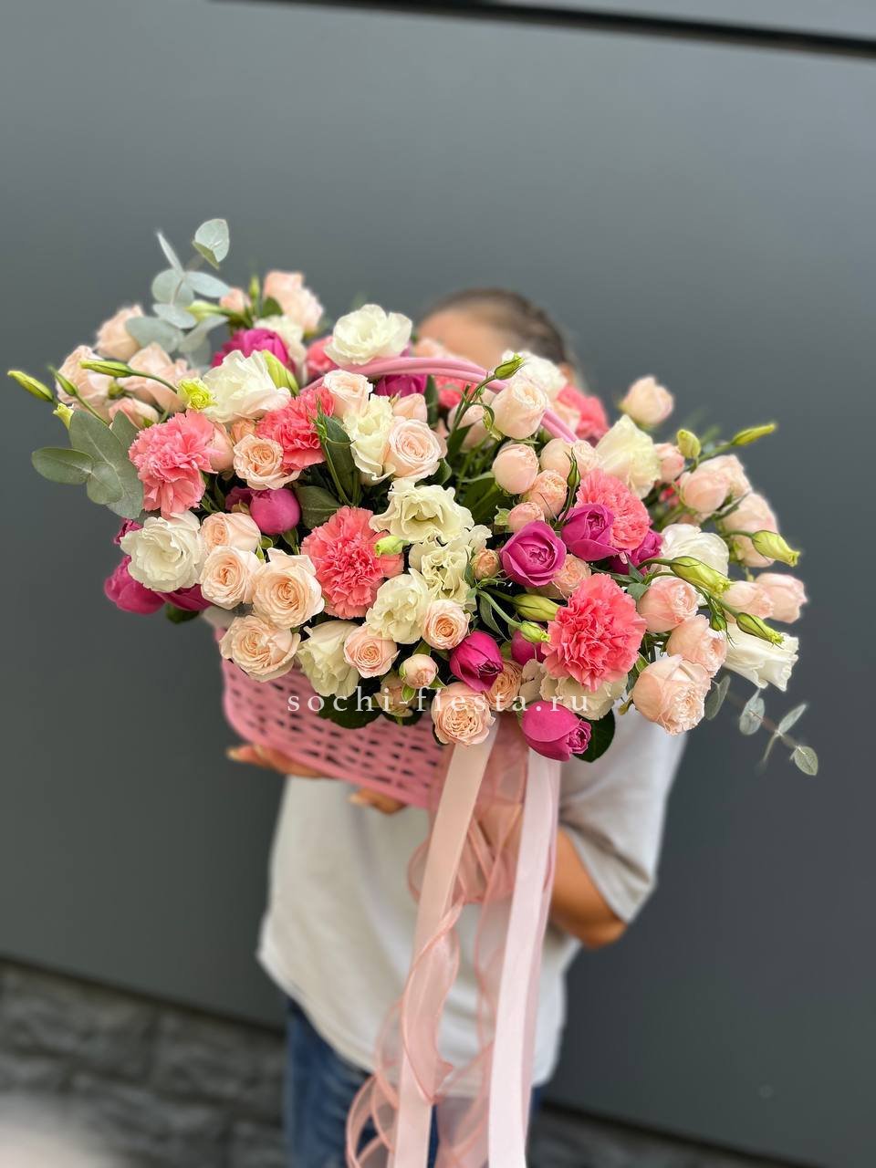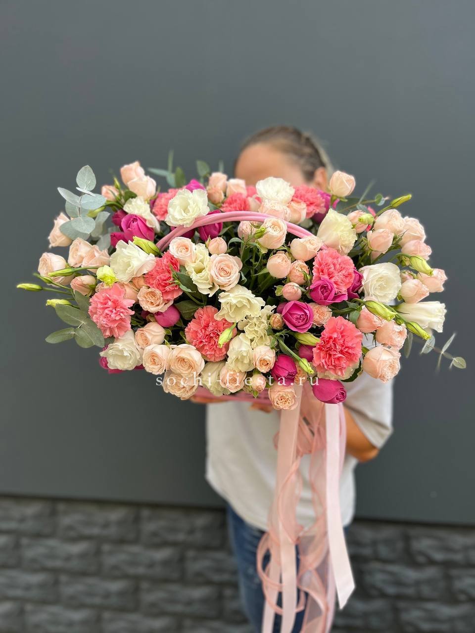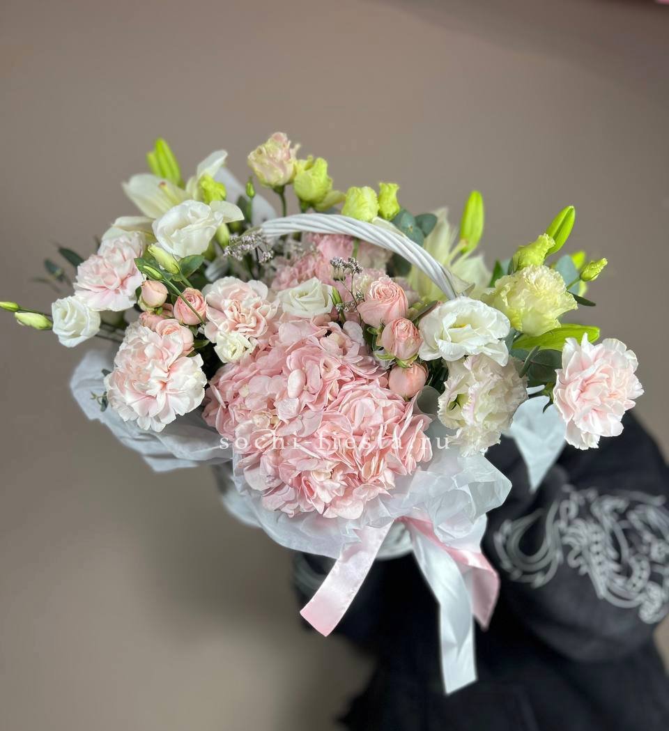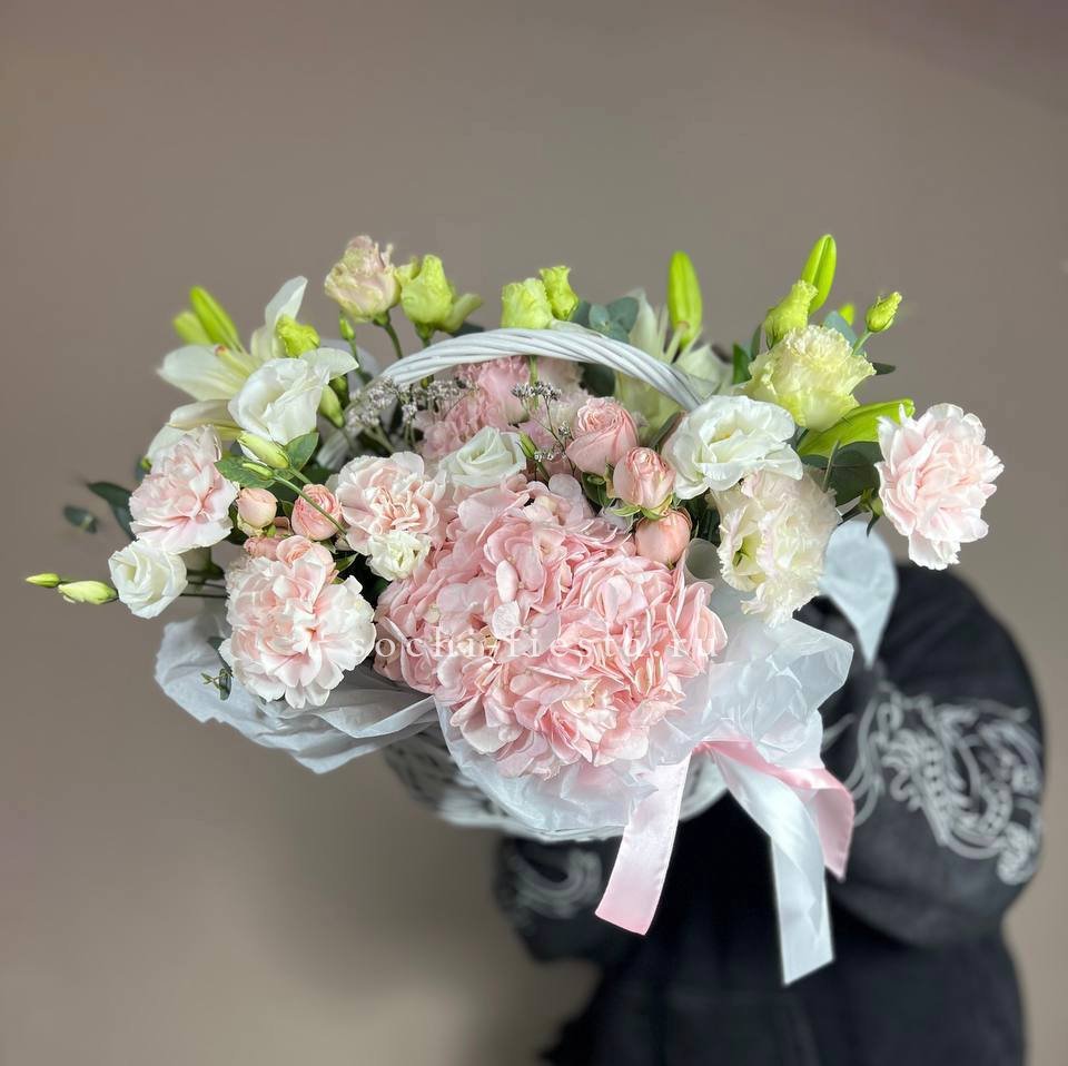гортензия, эустома, пионовидная кустовая роза, розы одноголовые, диантусы, вспомогательная зелень, лента, корзина D45.