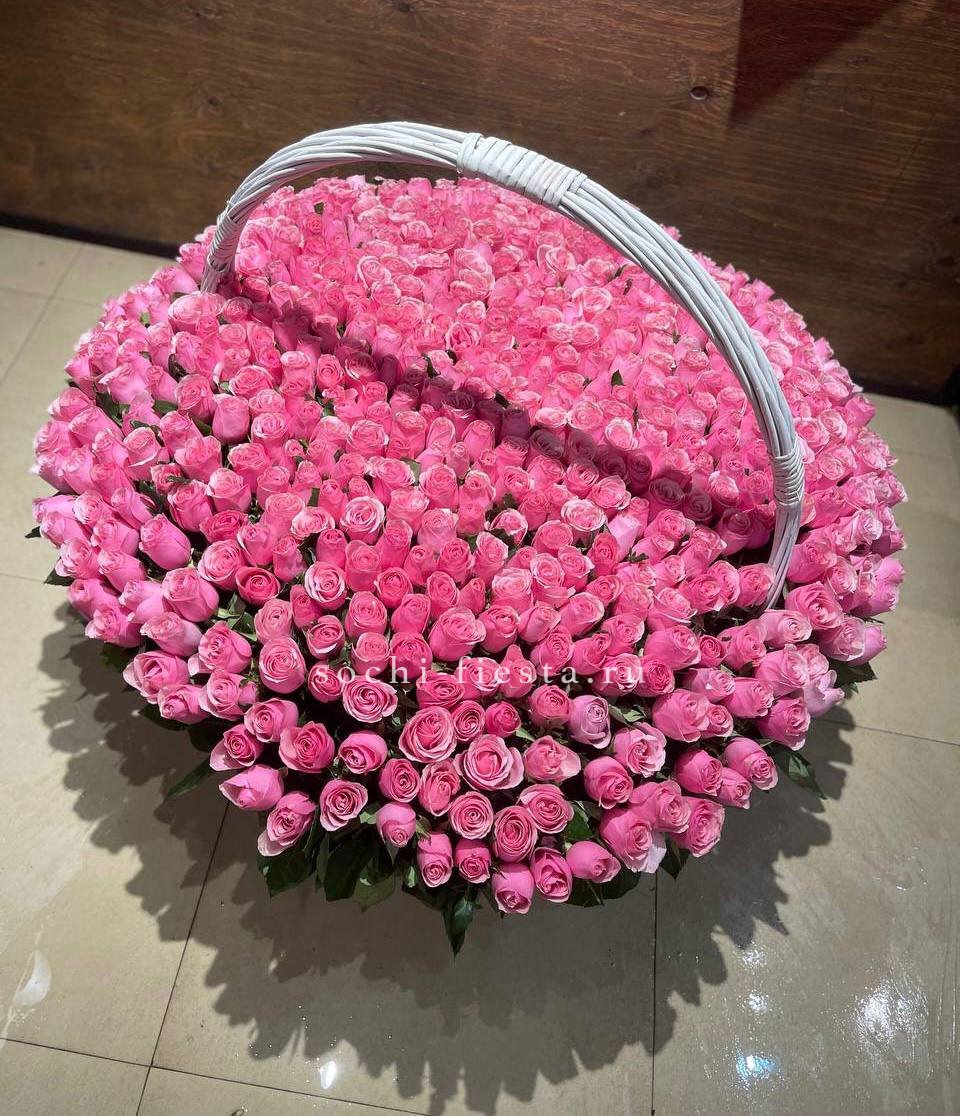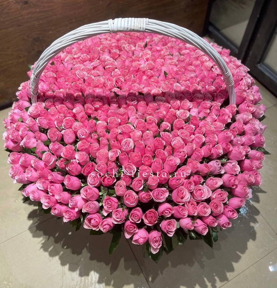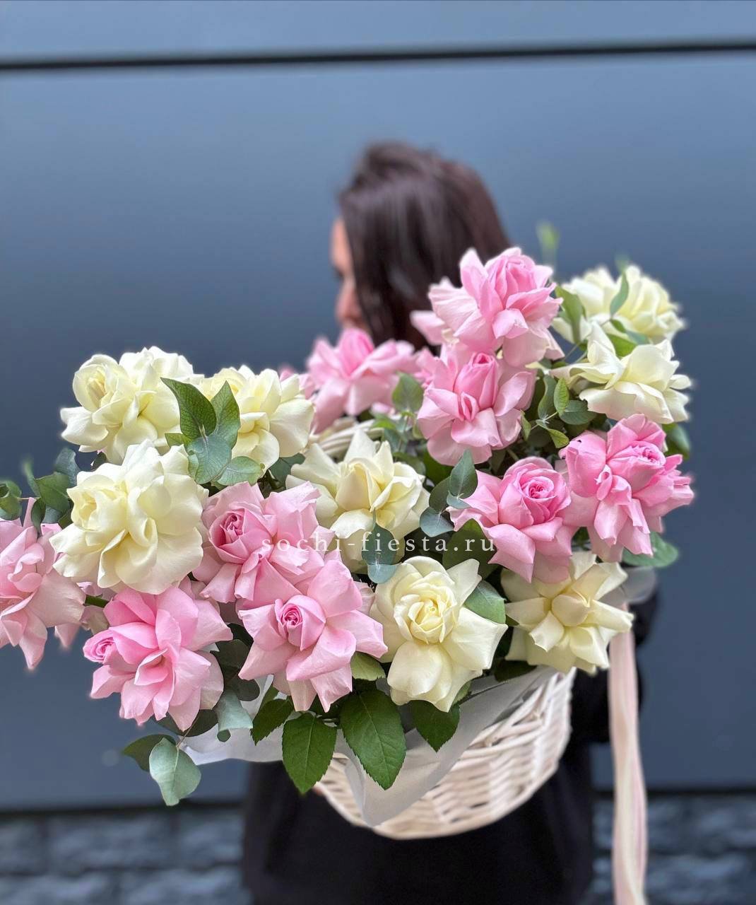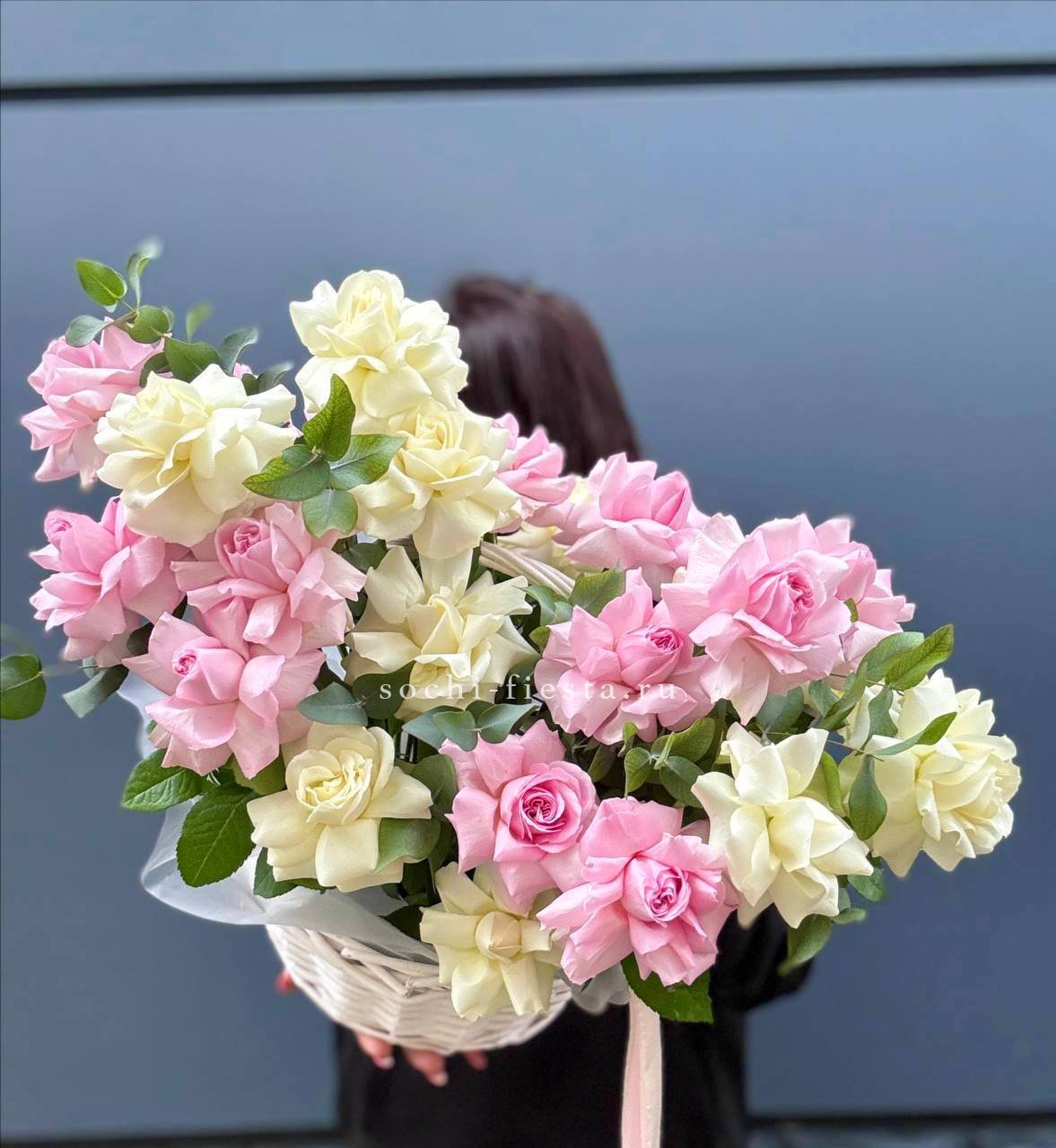 Пышная композиция в корзине собрана из роз двух видов и воздушной эустомы в бело-розовой гамме. Фисташка добавляет свежести, а округлая форма создает ощущение наполненности и объема.