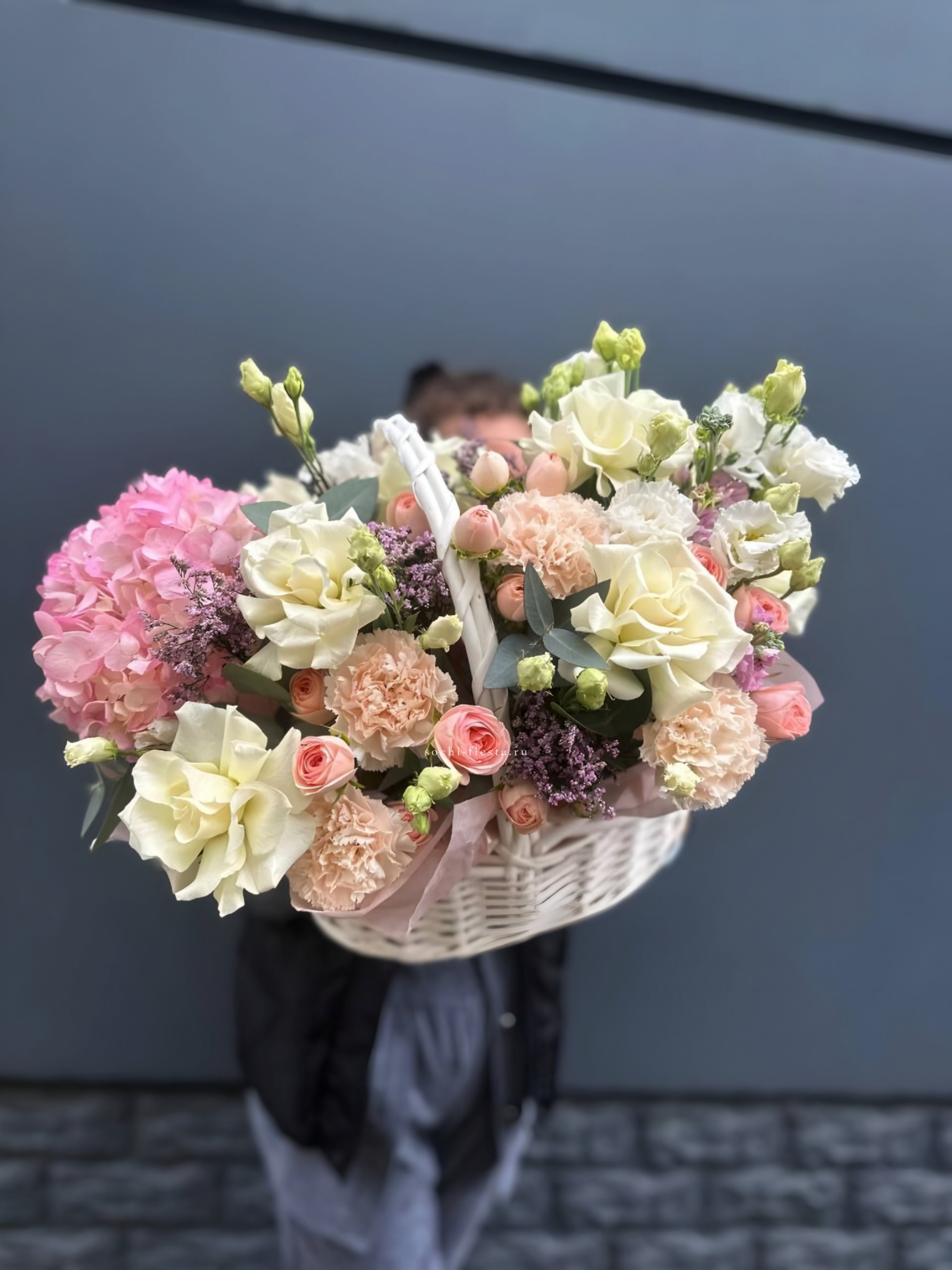 Пышная корзина объединяет пионовидные розы с воздушной гортензией и многослойной эустомой. Матиолла и лимониум добавляют глубину композиции, а диантус создает мягкие переходы между крупными бутонами.