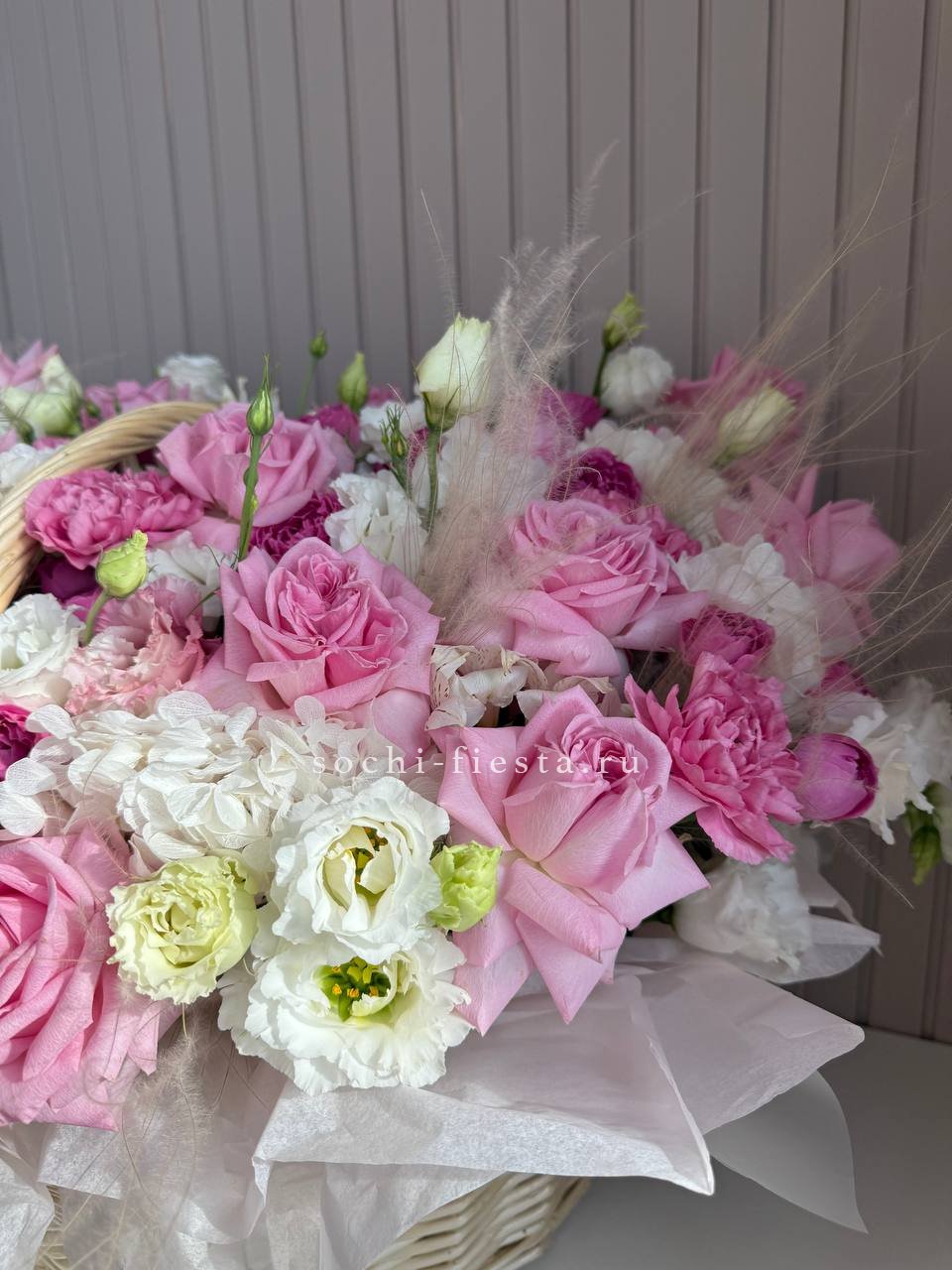 Корзина объединяет садовые розы с воздушной эустомой и яркими вспышками альстромерии. Ковыль добавляет лёгкости, а гортензия создаёт фактурный фон для всей композиции.
