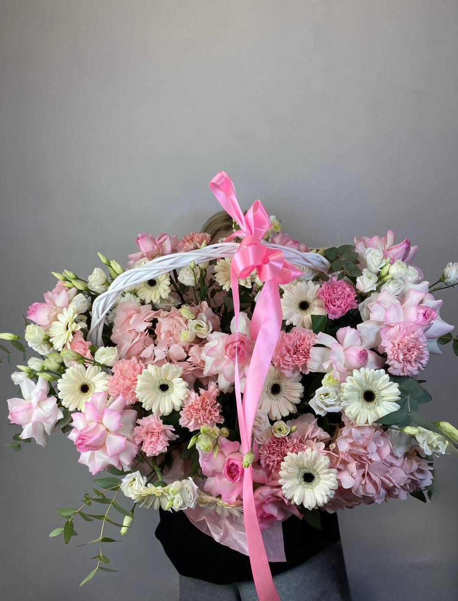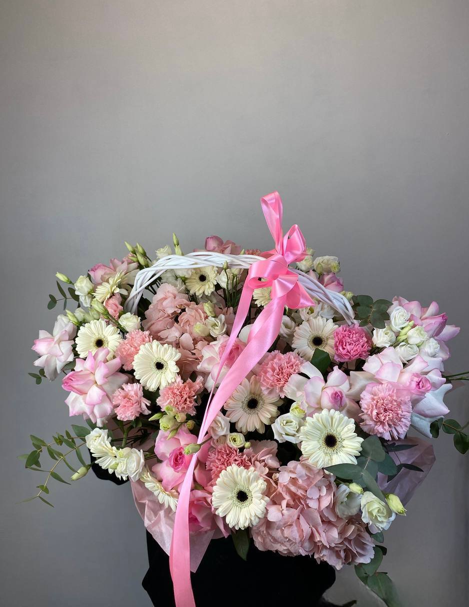 Воздушные соцветия эустомы собраны в округлую композицию с мягким переходом пастельных тонов. Светлая корзина создает легкую базу для объемной цветочной шапки.